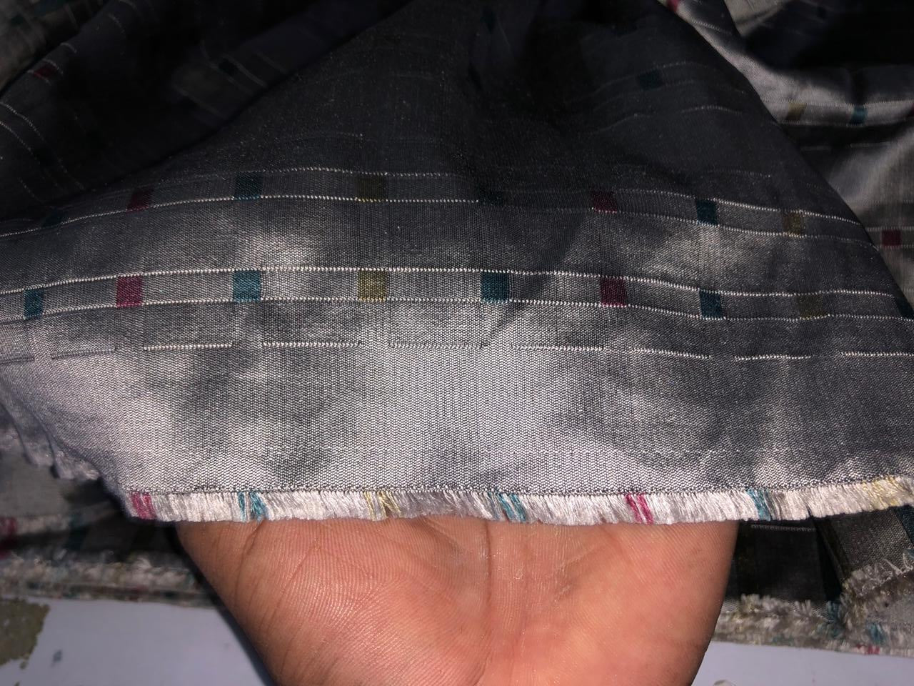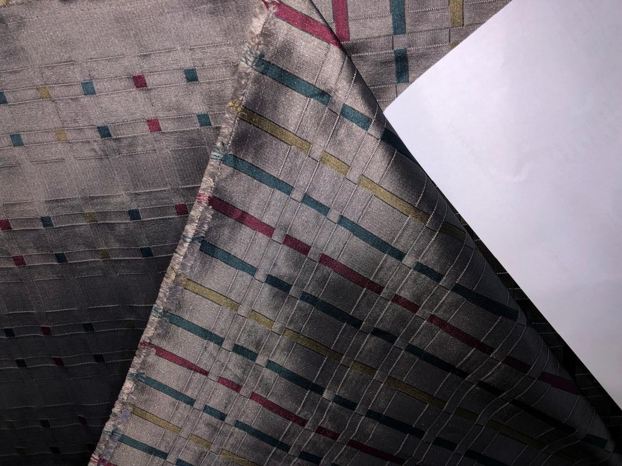 100% Silk Taffeta Jacquard Fabric  GREY jacquard plaids  with gold, kingfisher green and watermelon pink stripes 54" wide TAFJACNEW14[3]