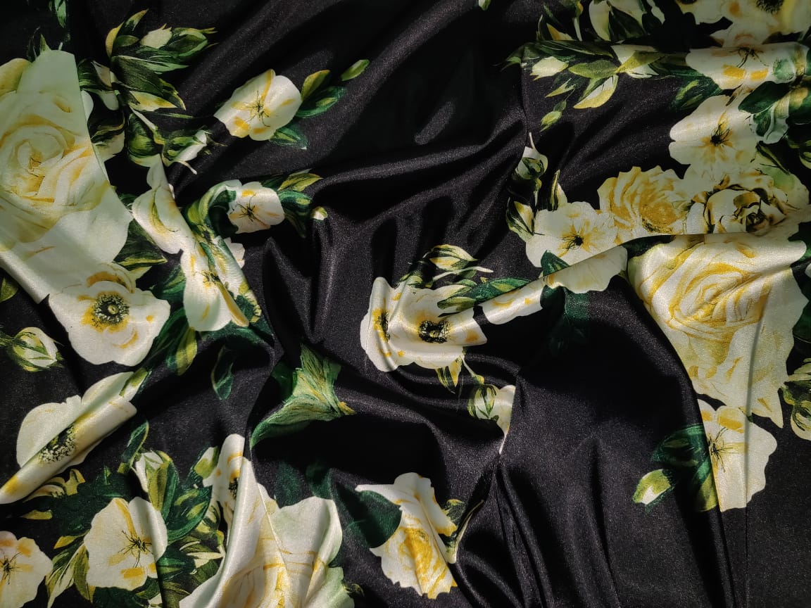 Satin luxurious navy blue with yellow floral print 58"wide [roll] SATIN_PRT_10499