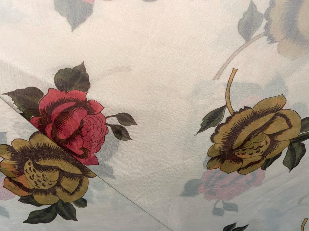 Silk chiffon printed  fabric cream with red and mustard  floral  44" wide [15480]