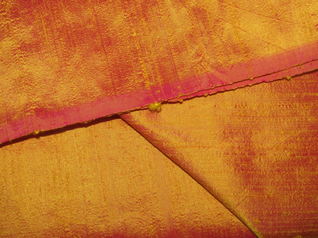 Dupioni (also referred to as Douppioni or Dupion) is a plain weave crisp type of silk fabric, produced by using fine thread in the warp and uneven thread reeled from two or more entangled cocoons in the weft. This creates tightly-woven yardage with a highly-lustrous surface.It is sometimes confused with 'shantung' or 'raw silk' which is usually lighter in weight and has a finer weave than dupion.