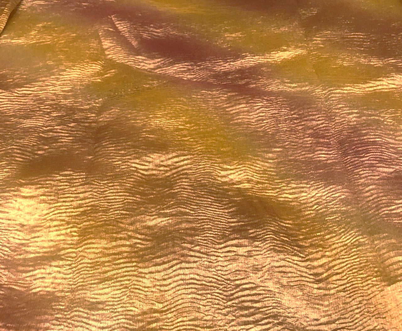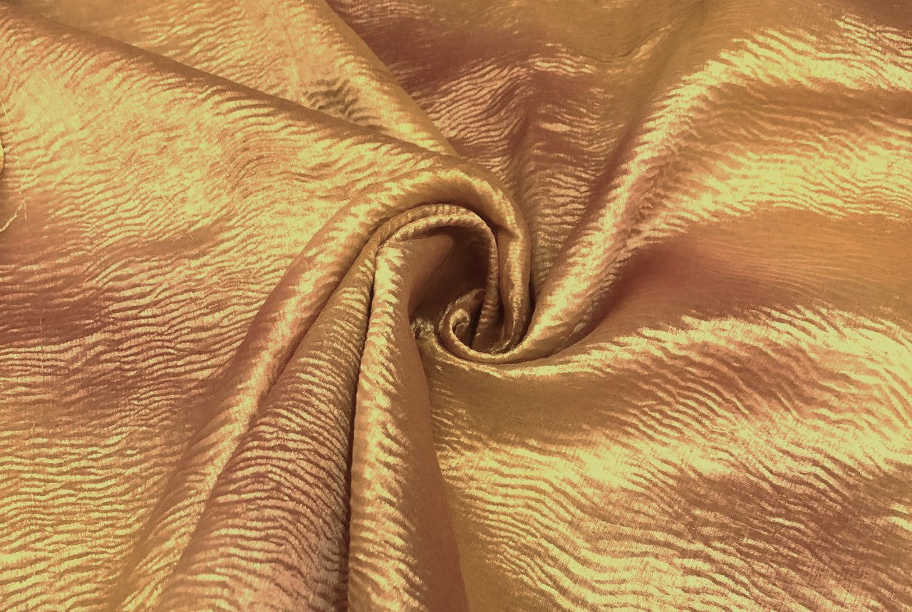A crushed tissue stripe is a lightweight, often sheer fabric with a permanent crinkled or wrinkled texture and a striped pattern. The combination of the metallic sheen and the textured stripes gives the fabric a rich, artistic, and luxurious look.