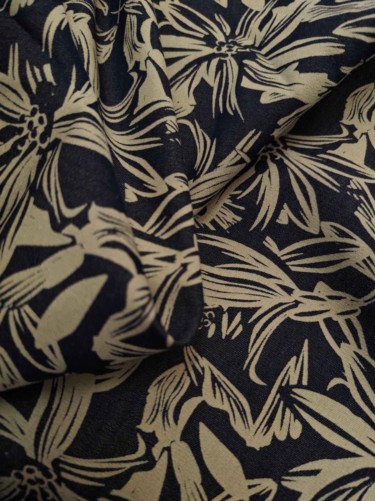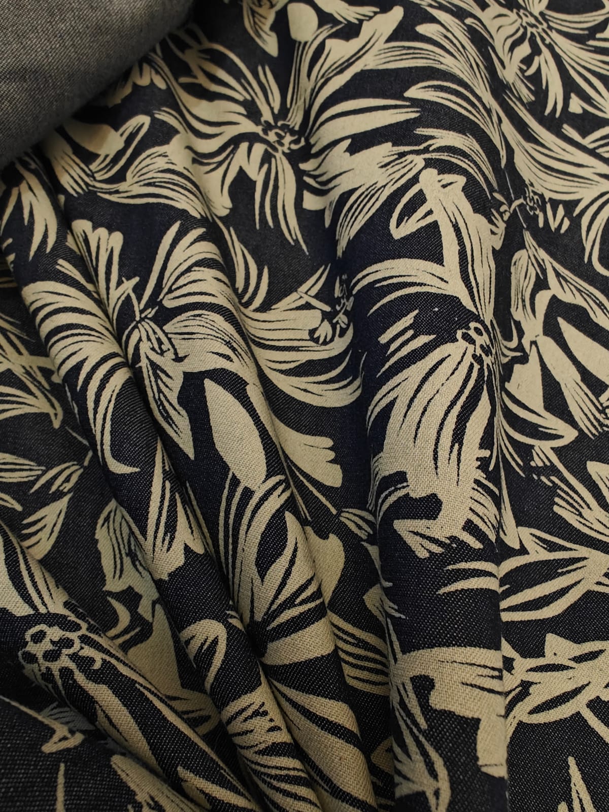 A modern fashion editorial featuring a confident female model wearing a relaxed yet structured outfit crafted from pre-washed denim dobby fabric. The fabric shows a subtle dobby texture, soft matte finish, and natural indigo wash with gentle highs and lows. The silhouette is effortless—easy dress, co-ord set, or relaxed shirt—styled for everyday comfort. Shot in soft natural daylight, minimal background, clean styling, and neutral accessories