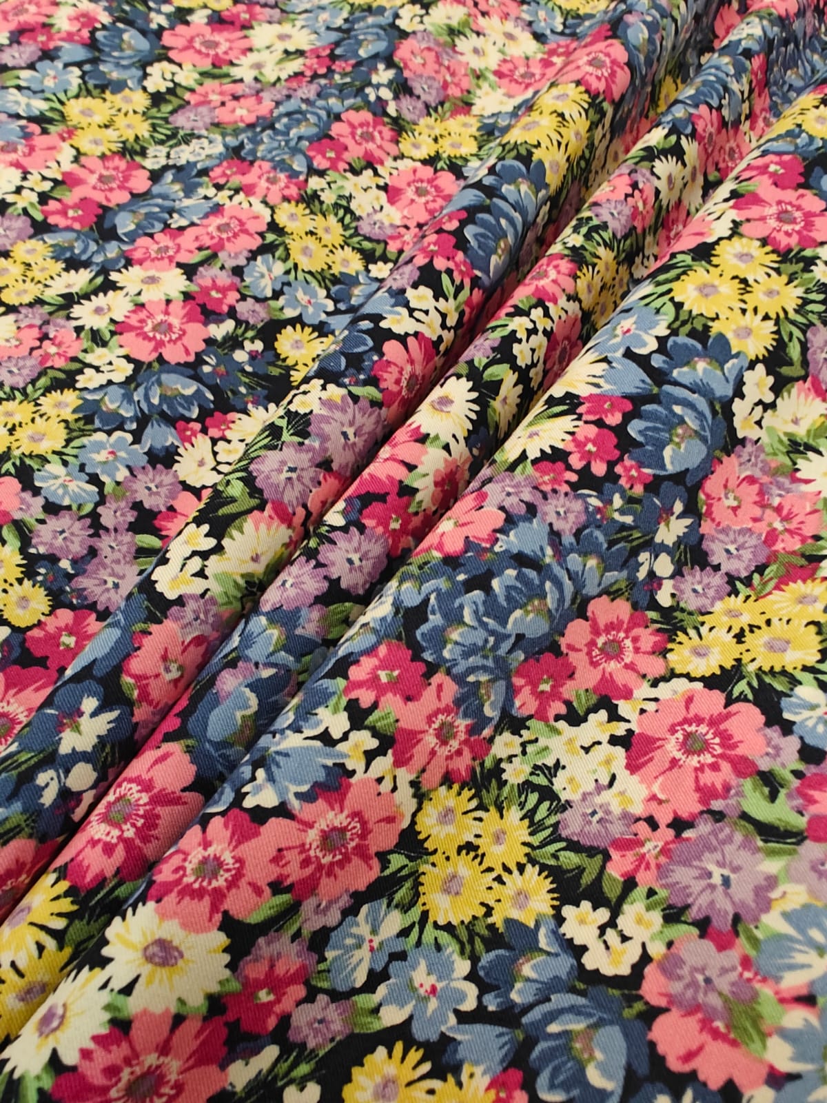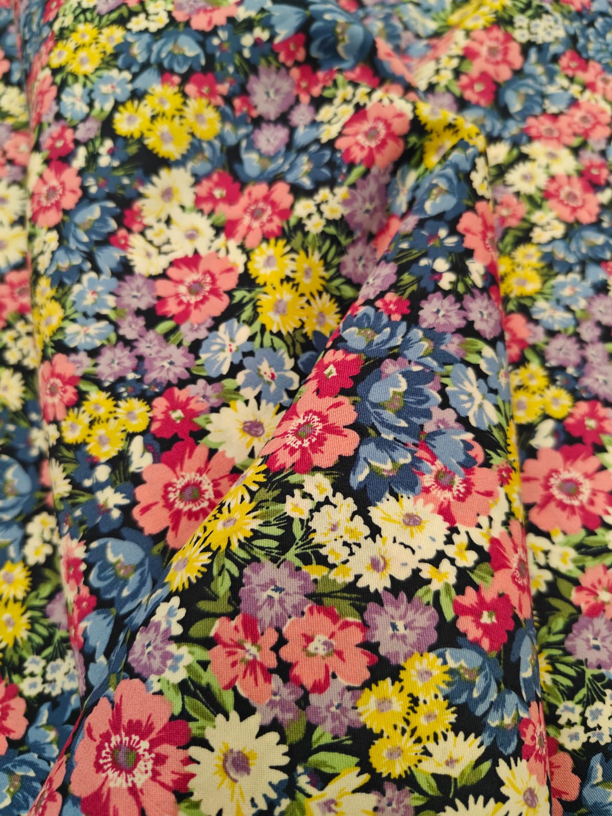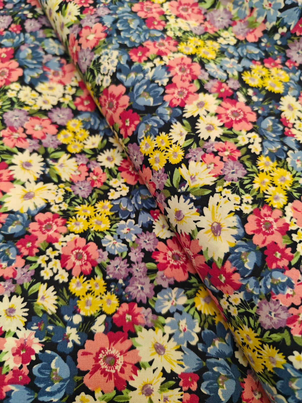 100% cotton poplin print peach finish dark navy in multi flowers and leaves available in 2 sizes small and medium [20404/05]