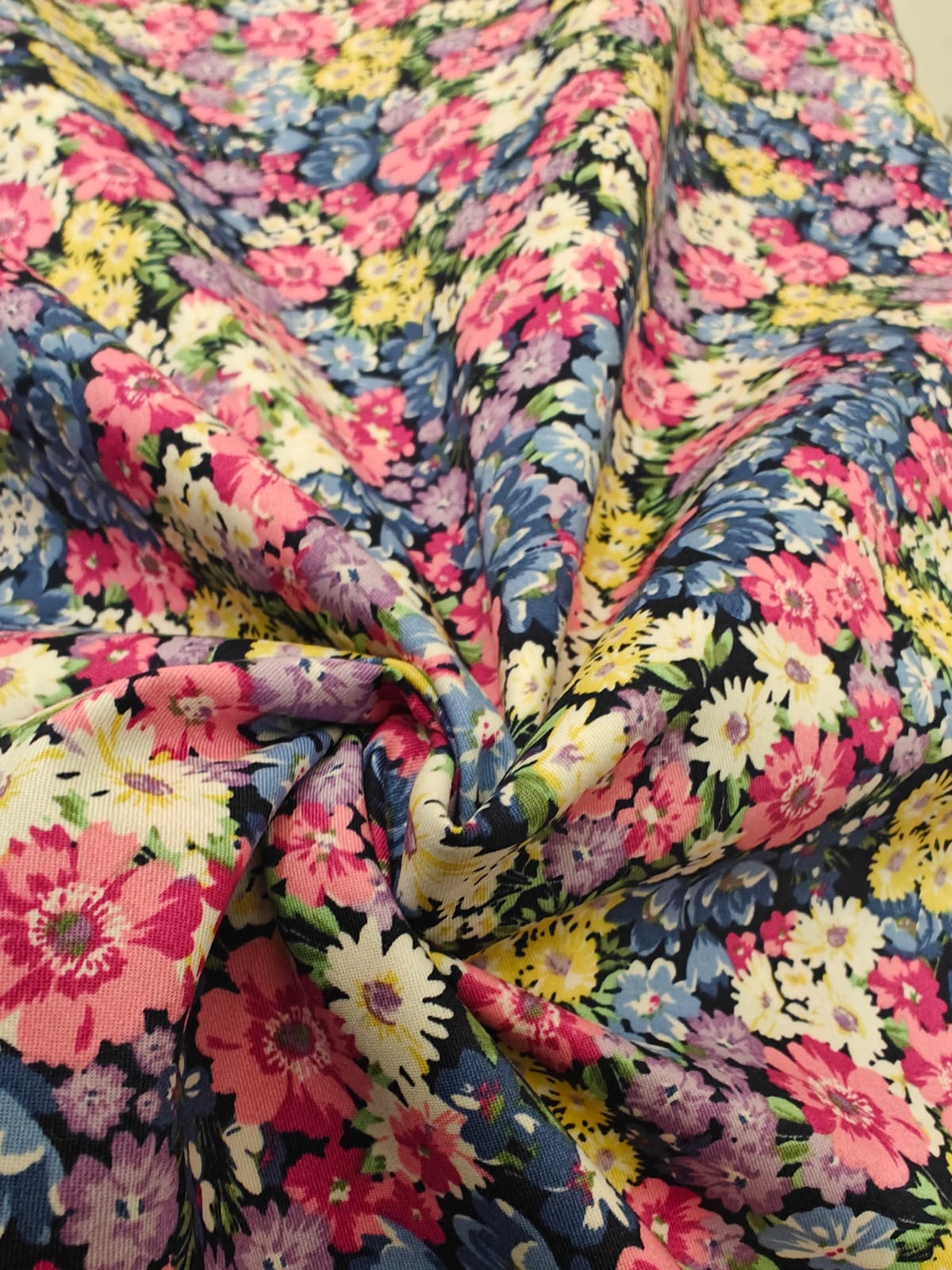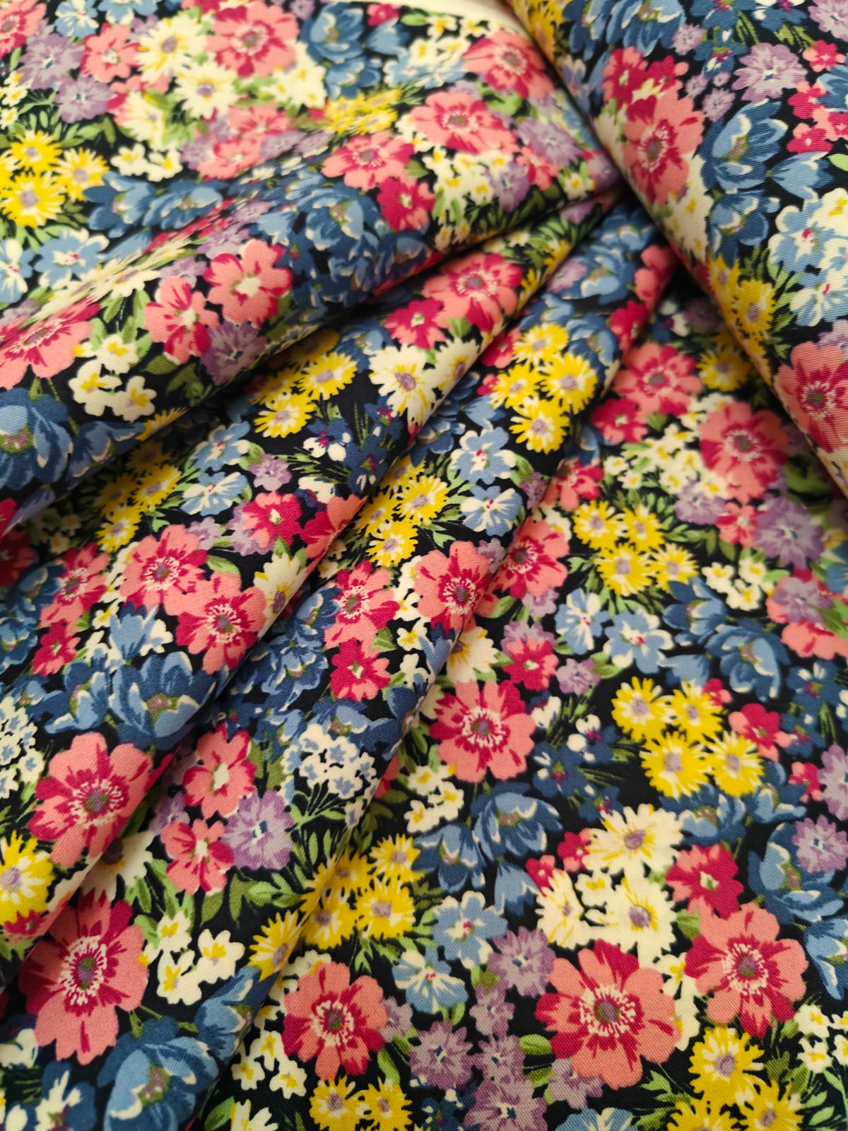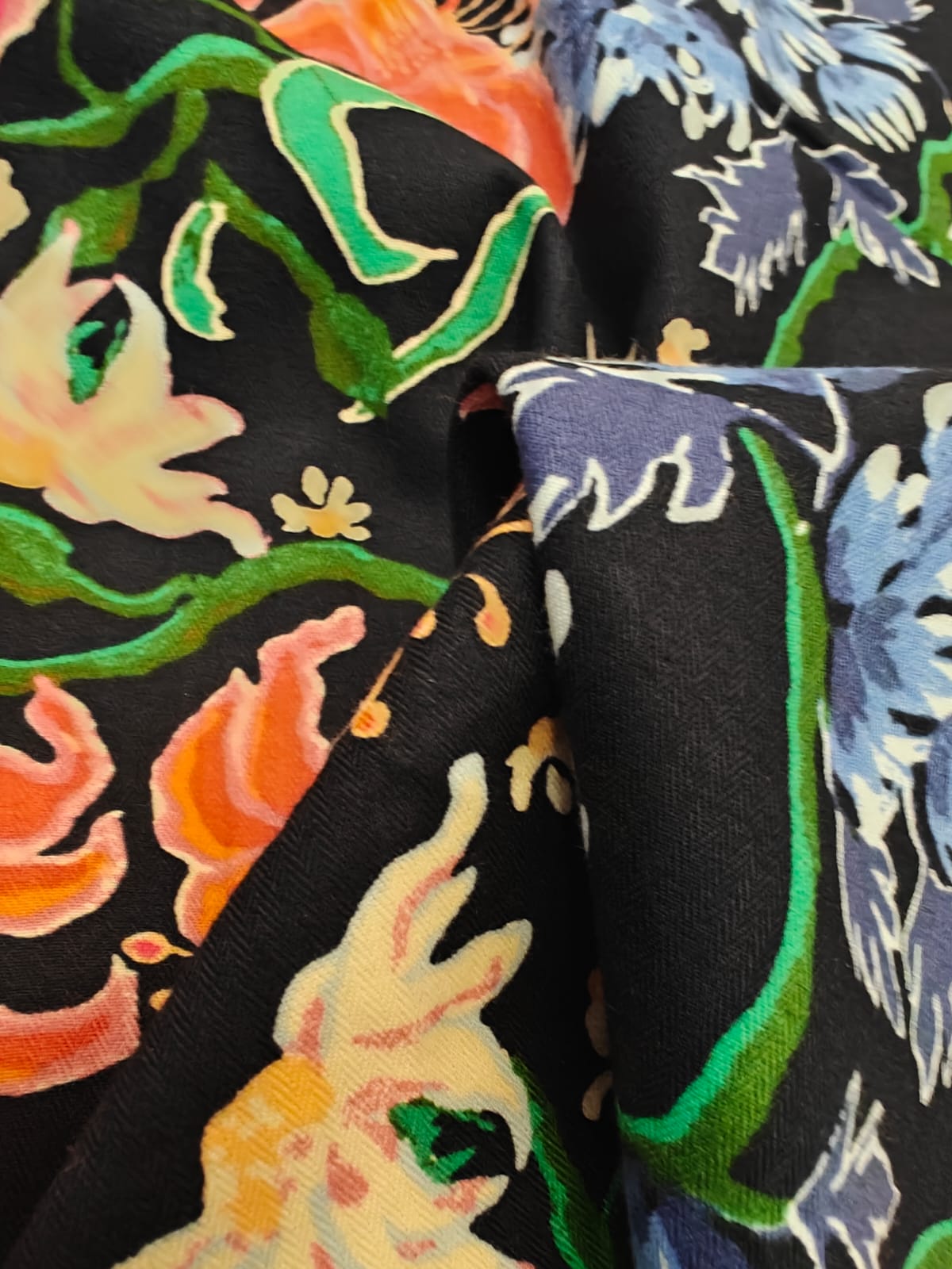 100% cotton poplin print peach finish dark navy in multi flowers and leaves available in 2 sizes small and medium [20404/05]