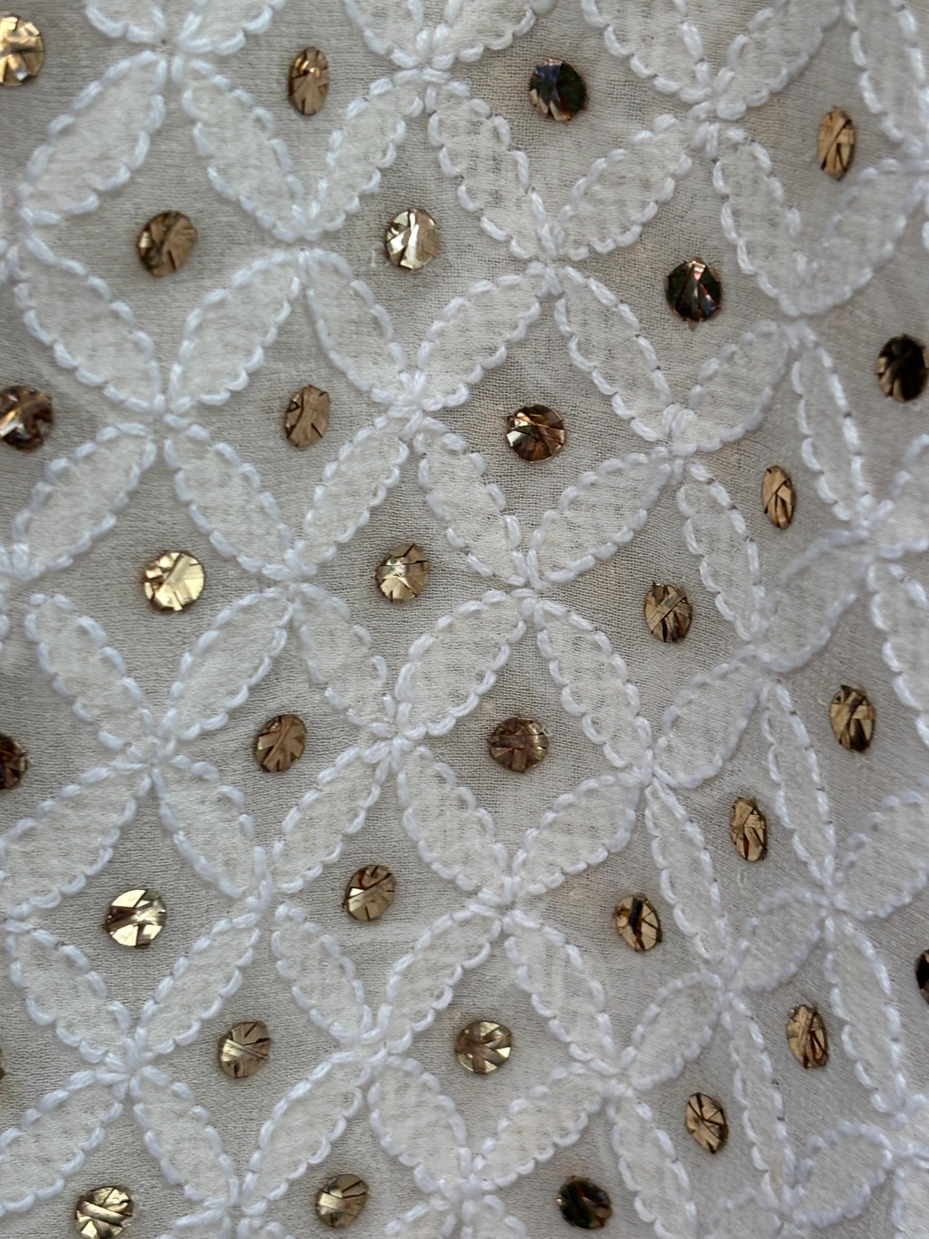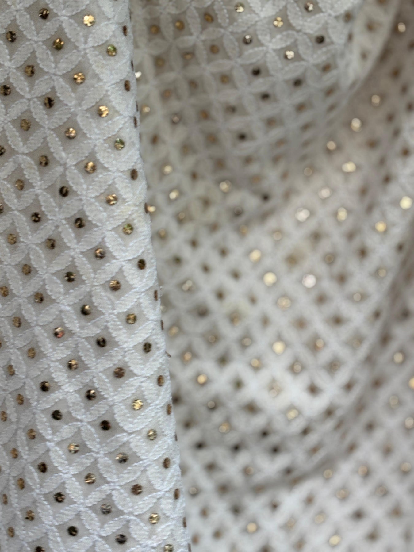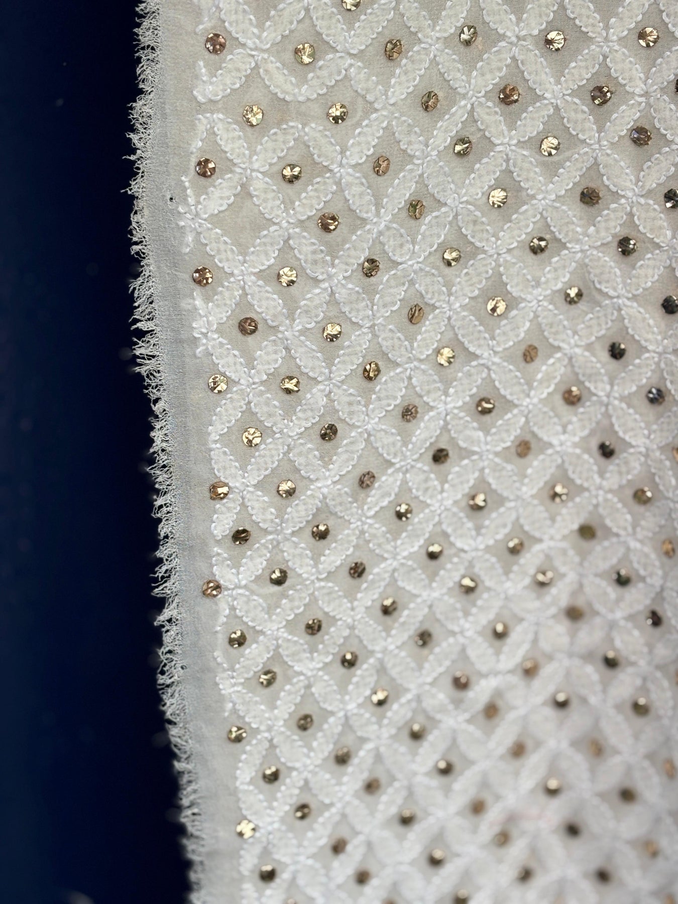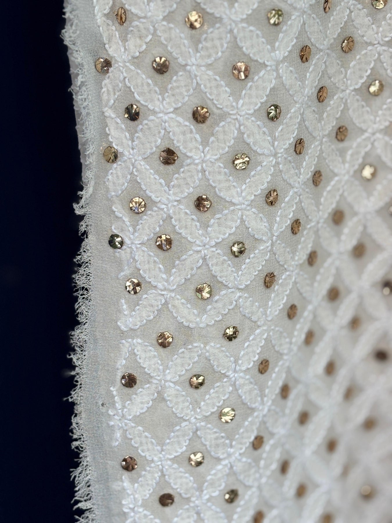 Mukesh embroidery, also known as Mukaish or Mokaish, is a traditional hand-embroidery technique from Lucknow, India. It features fine metallic threads usually silver or gold used to create delicate, shimmering patterns on fabrics like chiffon, silk, or cotton. Known for its elegant and intricate finish, Mukesh work is often used in ethnic and festive wear, adding a subtle touch of luxury and sparkle.