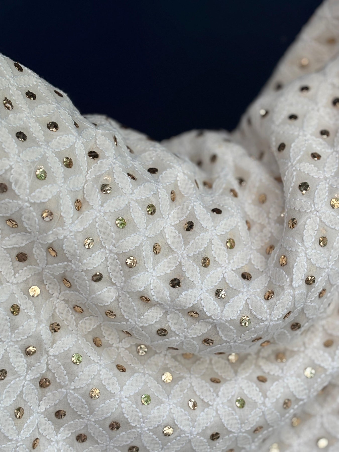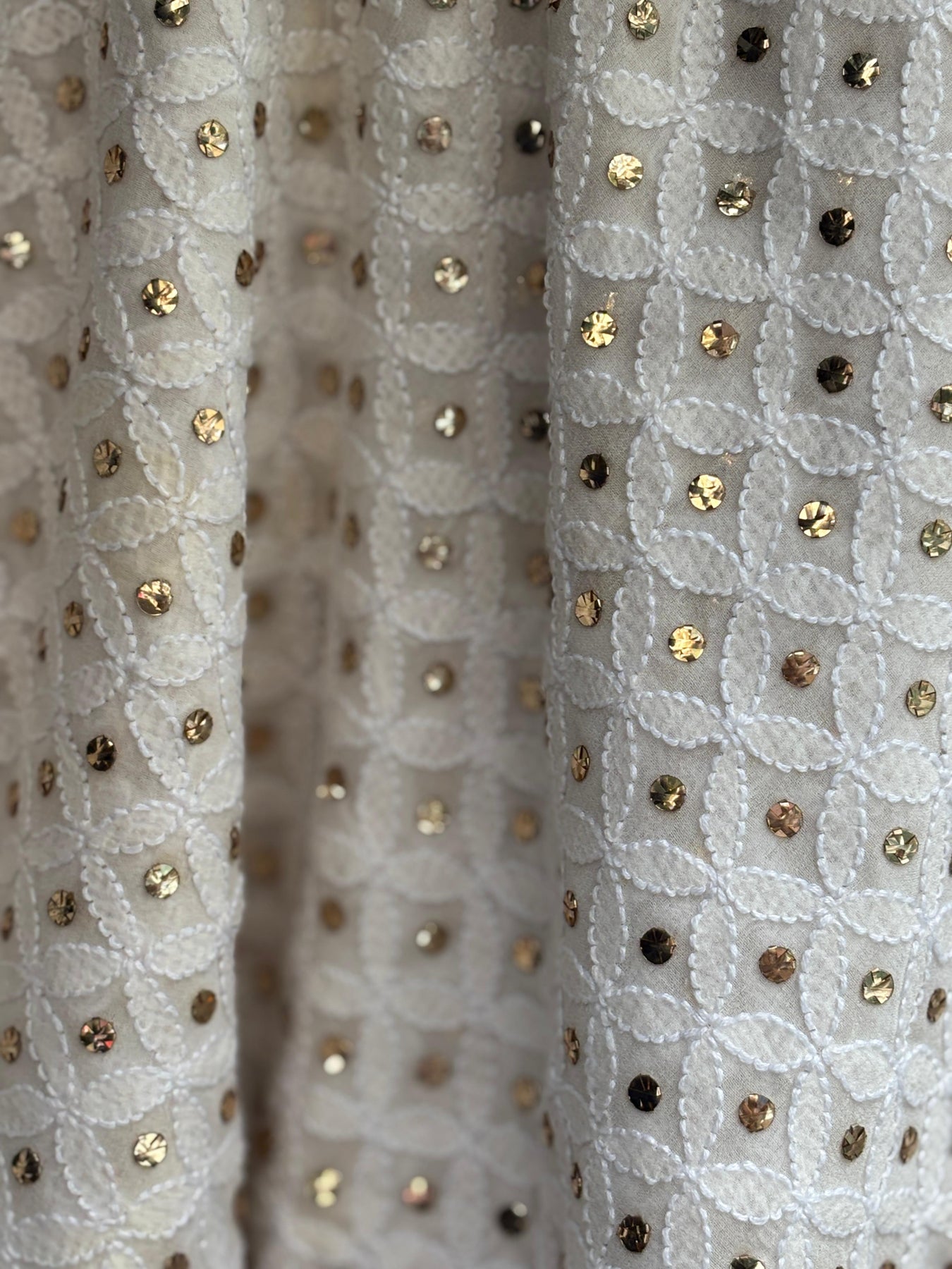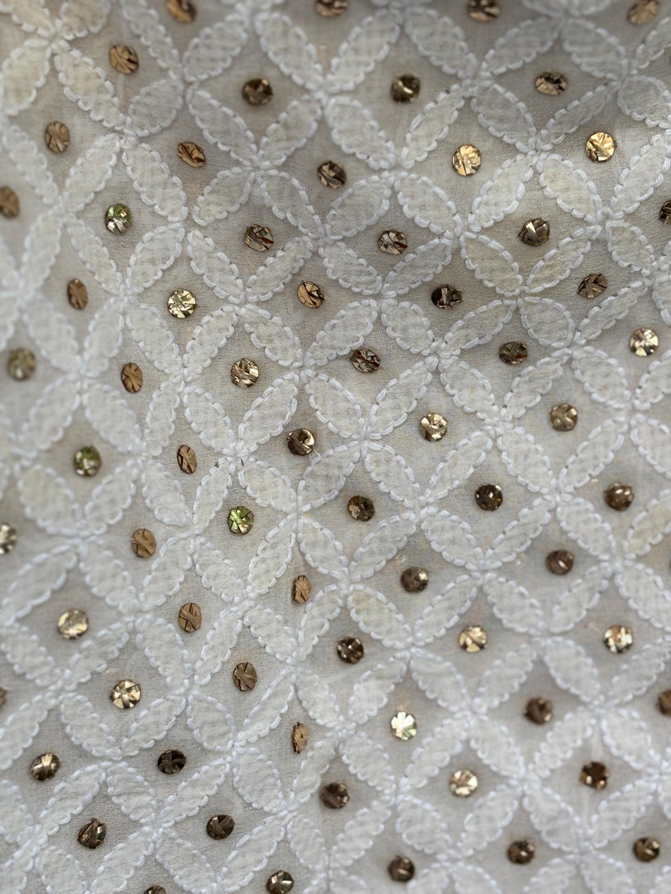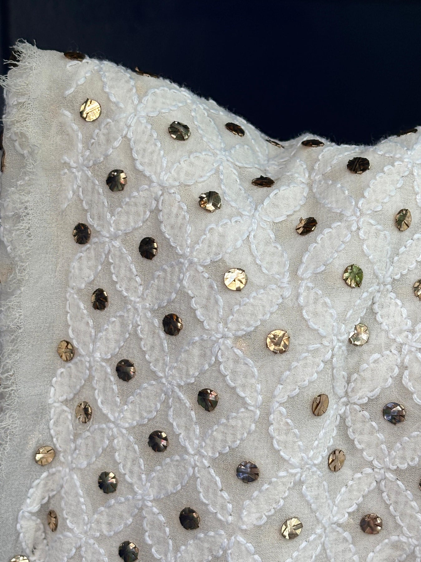 Mukesh embroidery, also known as Mukaish or Mokaish, is a traditional hand-embroidery technique from Lucknow, India. It features fine metallic threads usually silver or gold used to create delicate, shimmering patterns on fabrics like chiffon, silk, or cotton. Known for its elegant and intricate finish, Mukesh work is often used in ethnic and festive wear, adding a subtle touch of luxury and sparkle.
