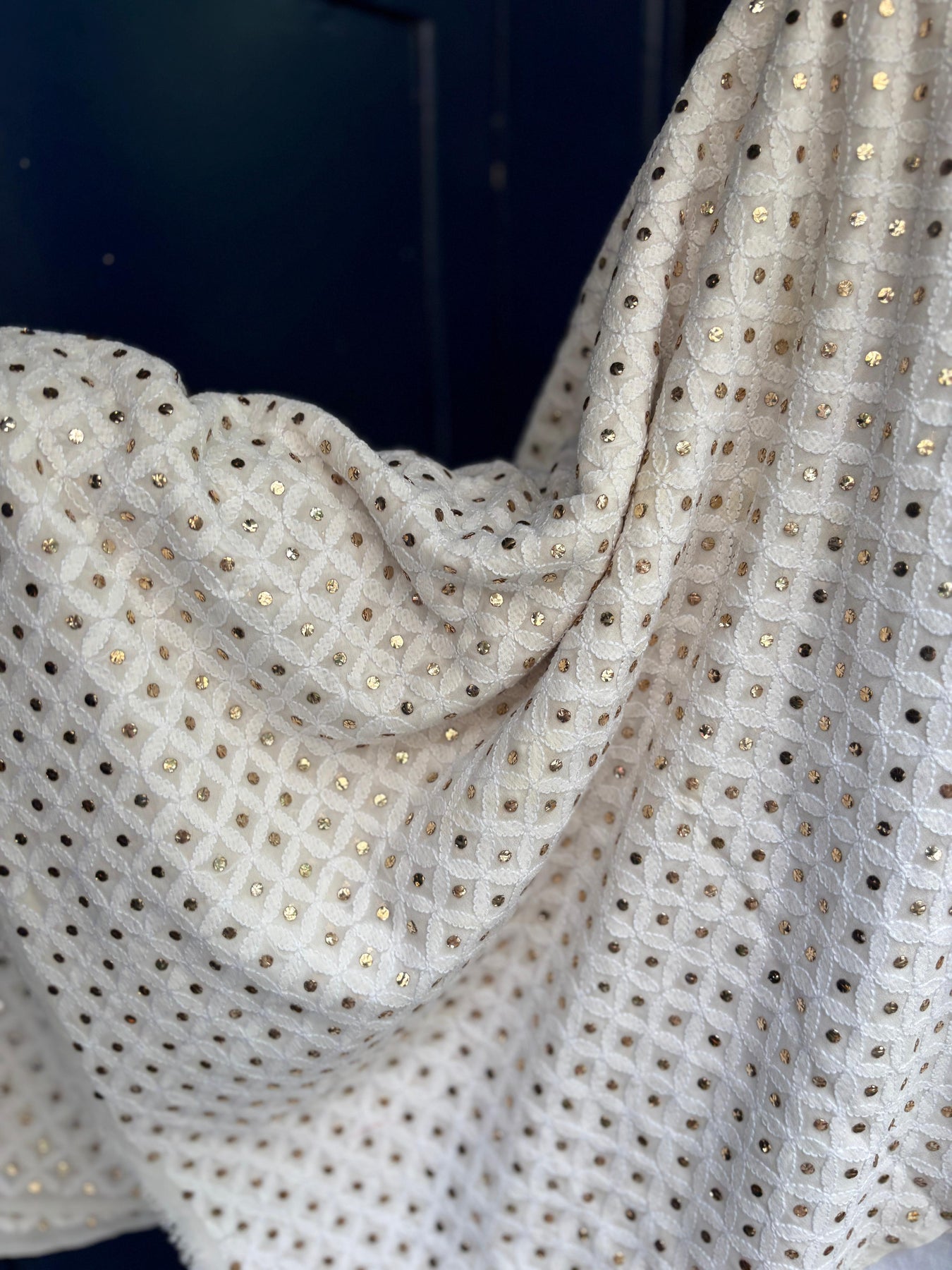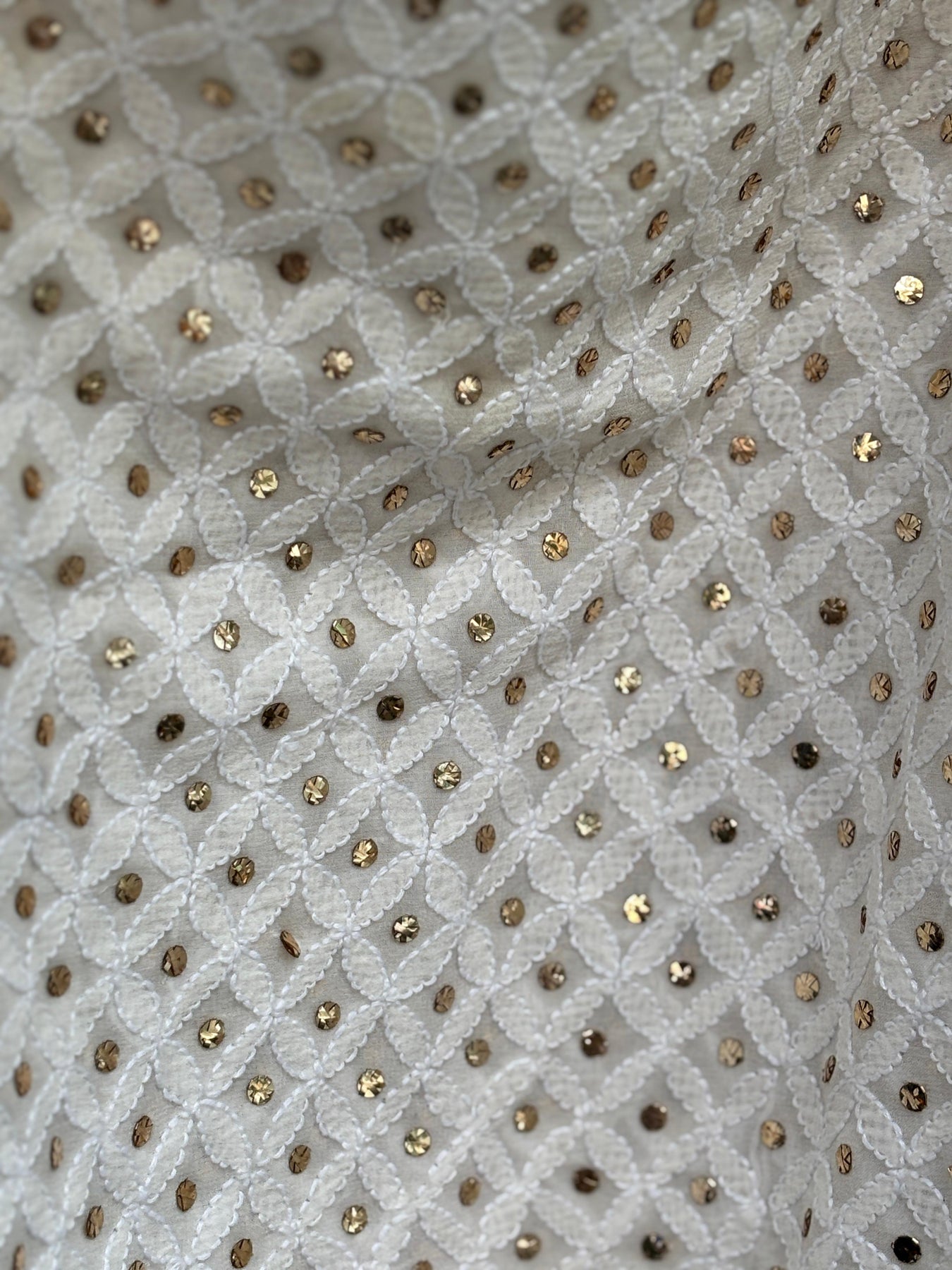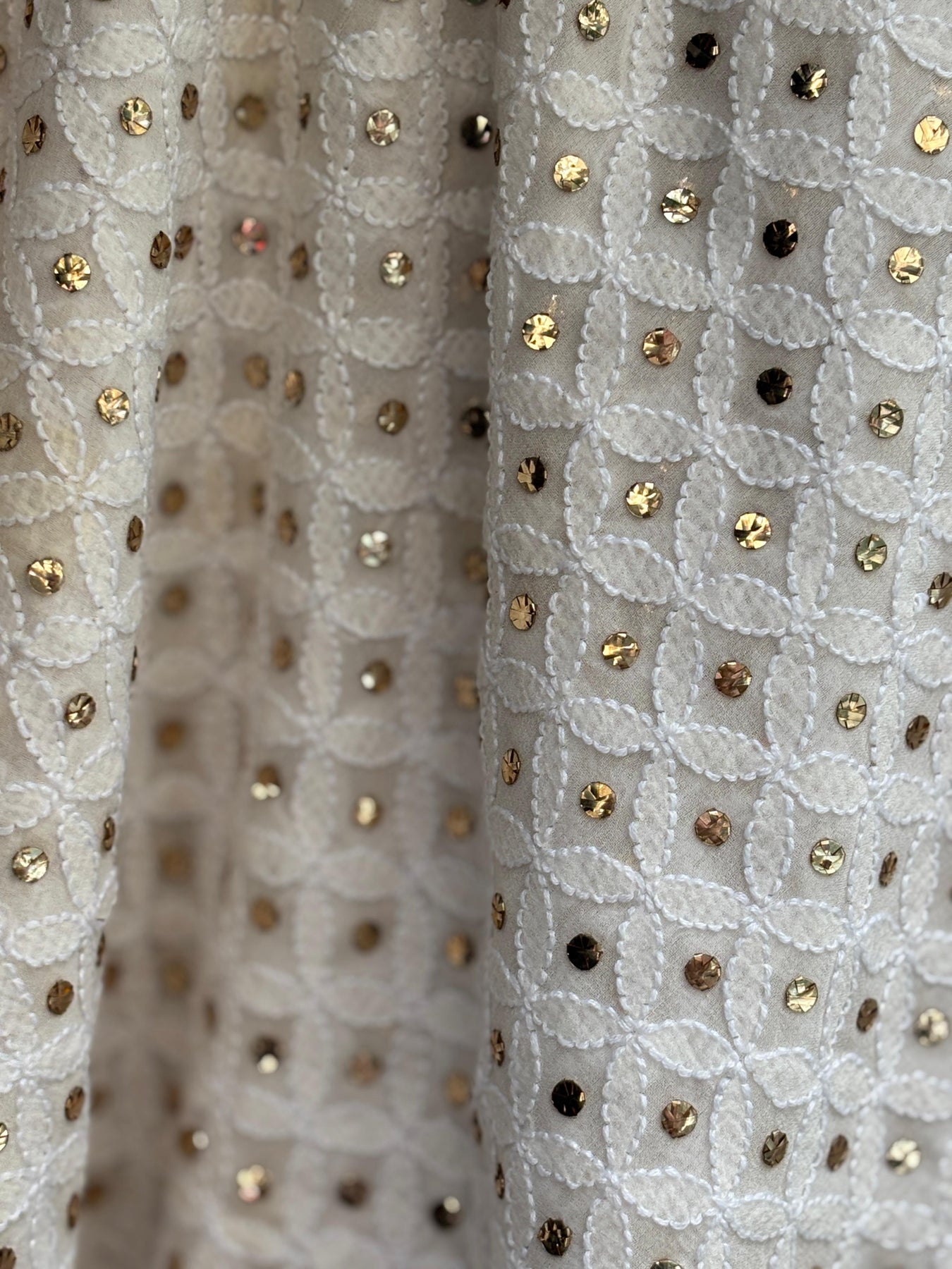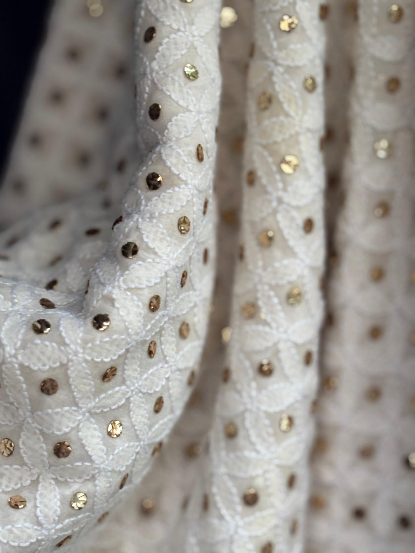 Mukesh embroidery, also known as Mukaish or Mokaish, is a traditional hand-embroidery technique from Lucknow, India. It features fine metallic threads usually silver or gold used to create delicate, shimmering patterns on fabrics like chiffon, silk, or cotton. Known for its elegant and intricate finish, Mukesh work is often used in ethnic and festive wear, adding a subtle touch of luxury and sparkle.