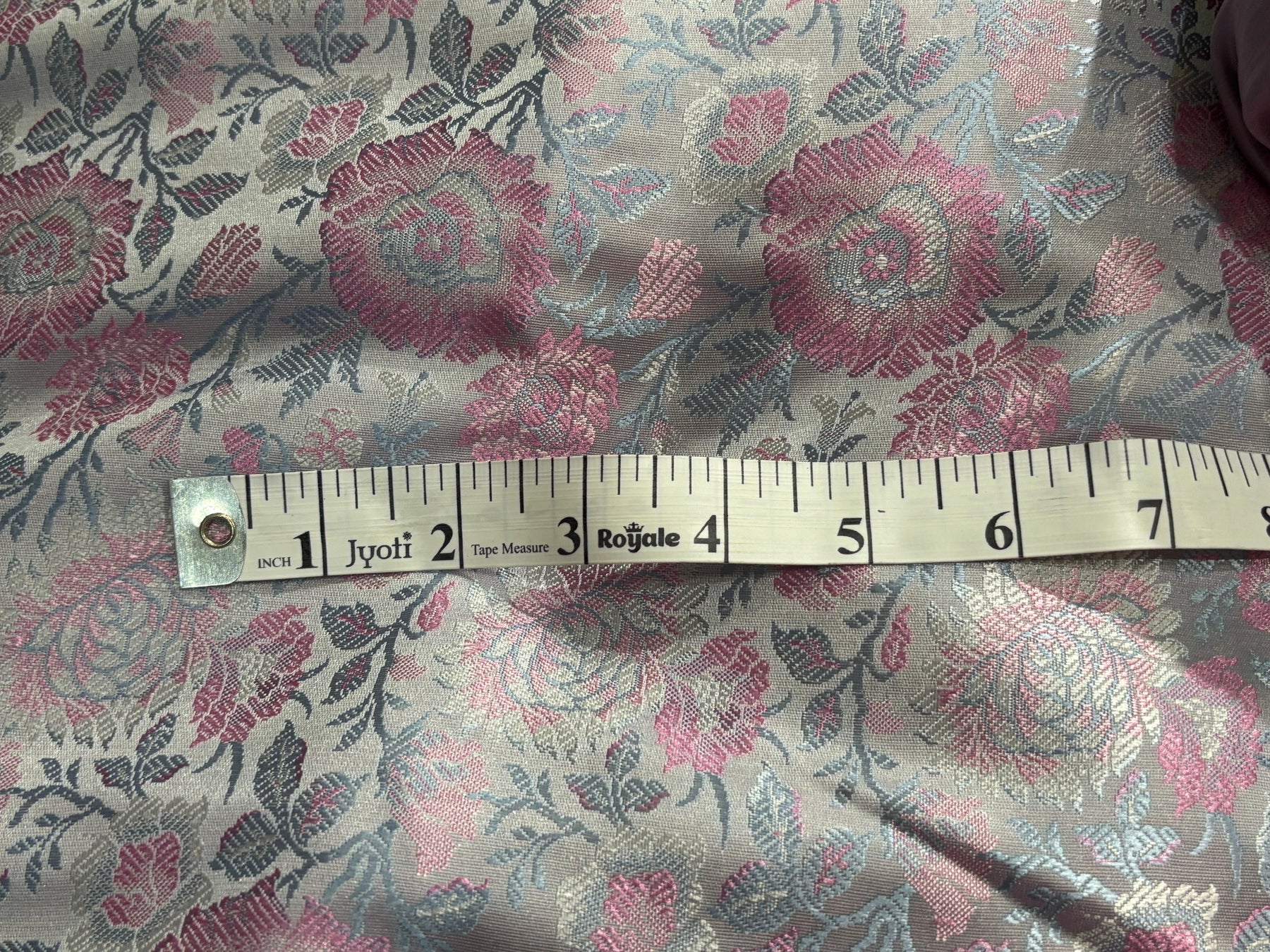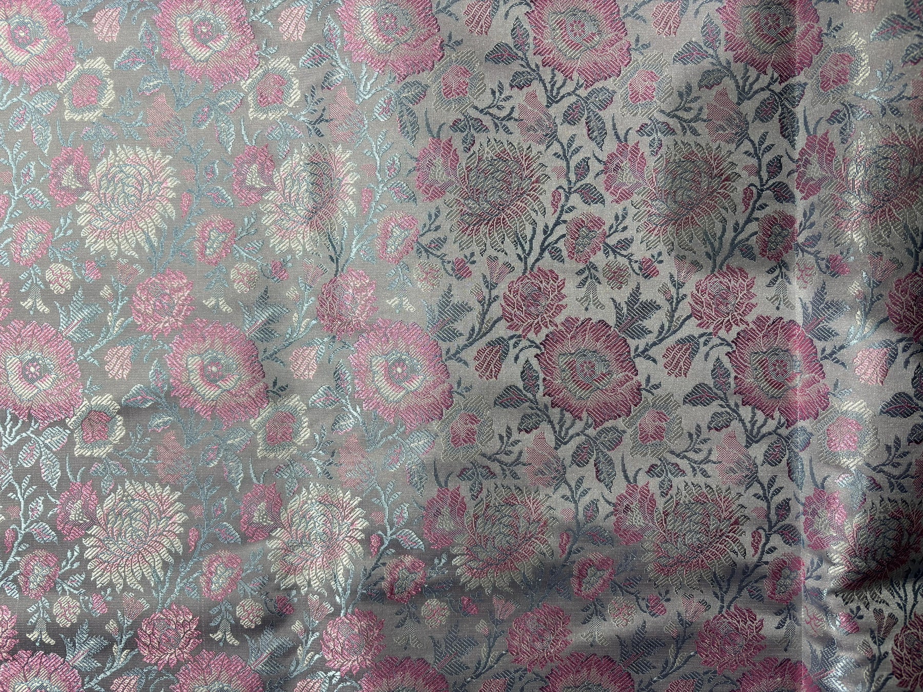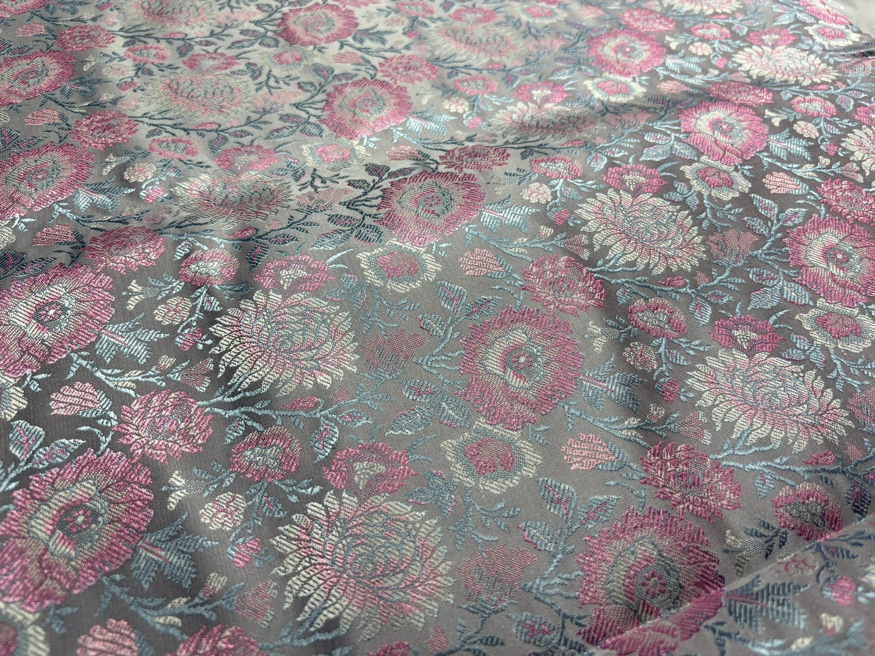 Silk Brocade fabric 44"silver grey with pink and blue floral  jacquard  BRO1064[1]