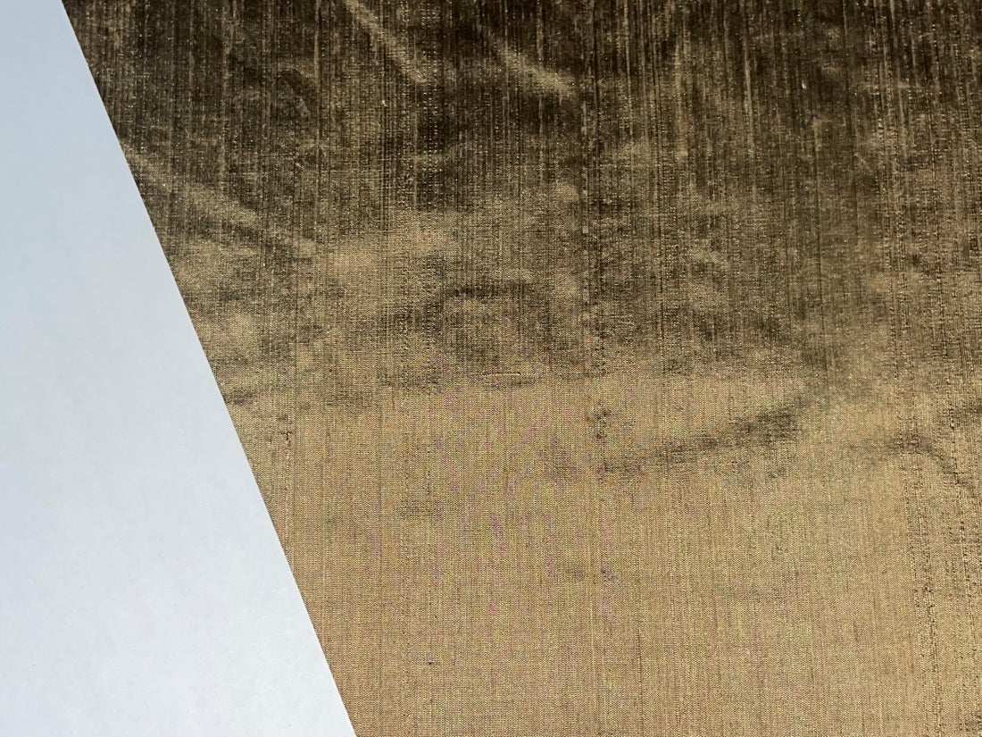 Dupioni (also referred to as Douppioni or Dupion) is a plain weave crisp type of silk fabric, produced by using fine thread in the warp and uneven thread reeled from two or more entangled cocoons in the weft. This creates tightly-woven yardage with a highly-lustrous surface. It is sometimes confused with 'shantung' or 'raw silk' which is usually lighter in weight and has a finer weave than dupion.