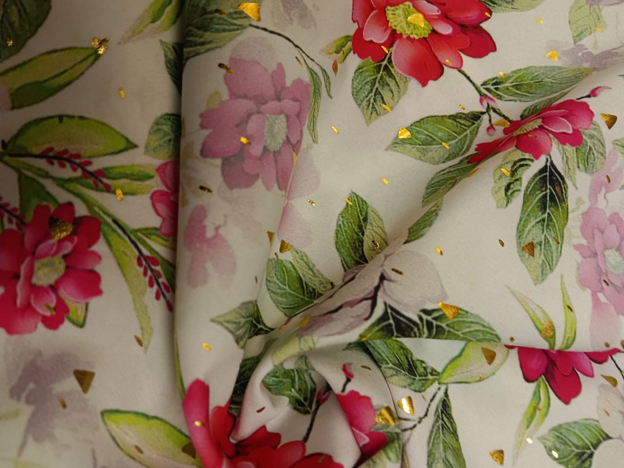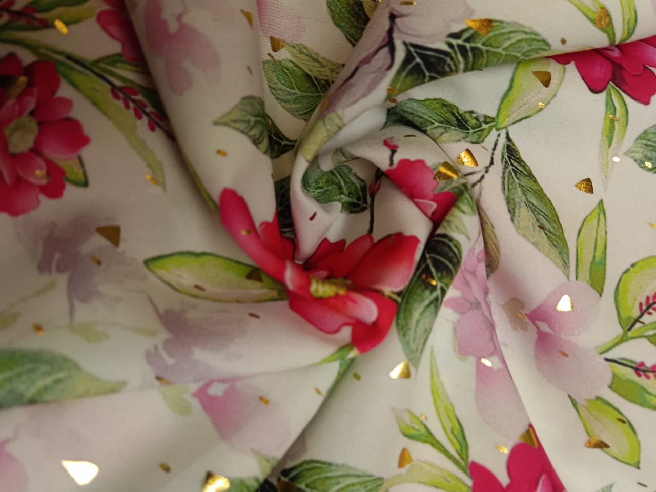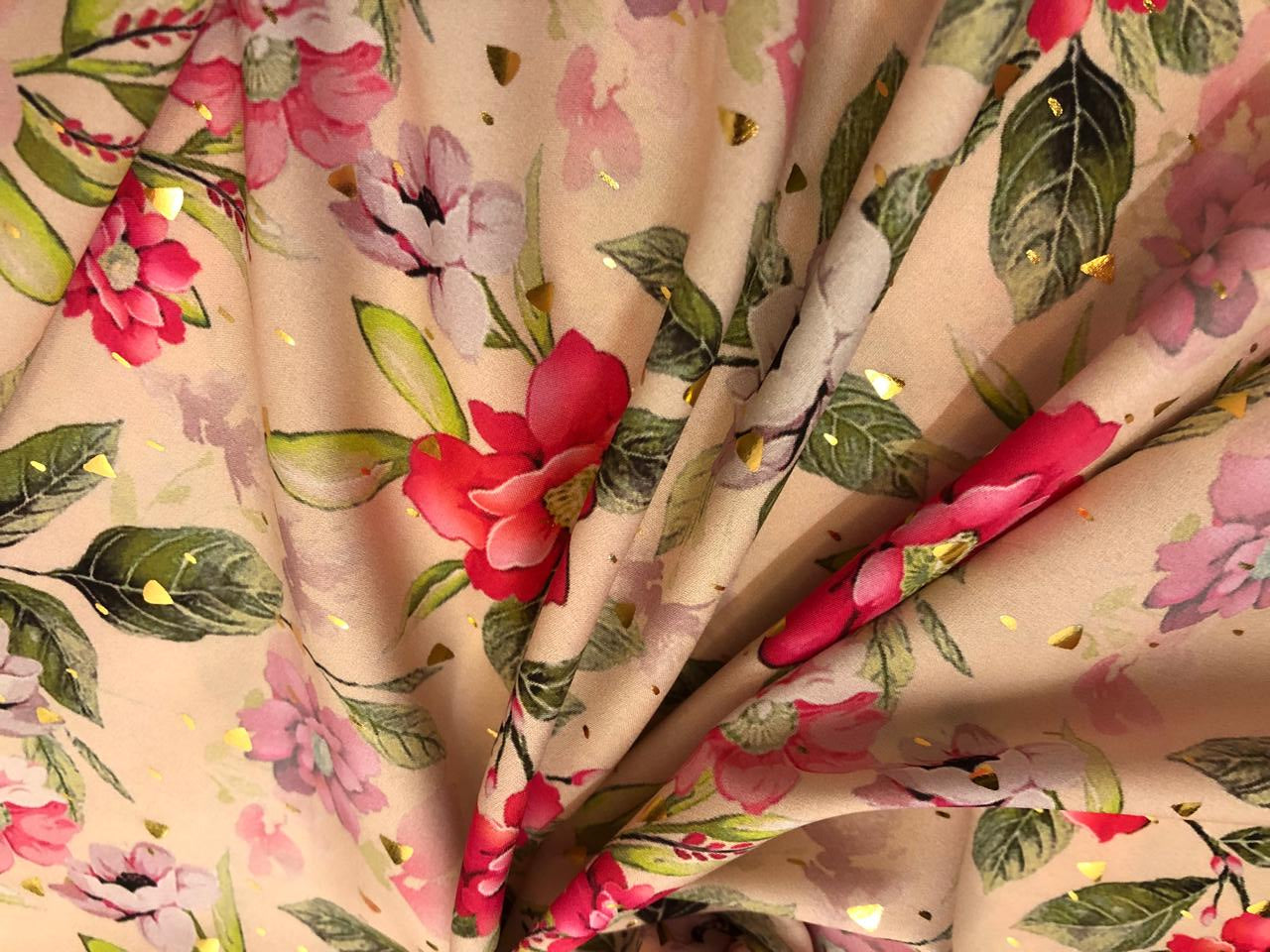 Satin fabric print 58" wide ARMANI  pink, lilac and green floral print and gold foil in 3 color background blush pink, powder blue and white[19064/69/70] ]