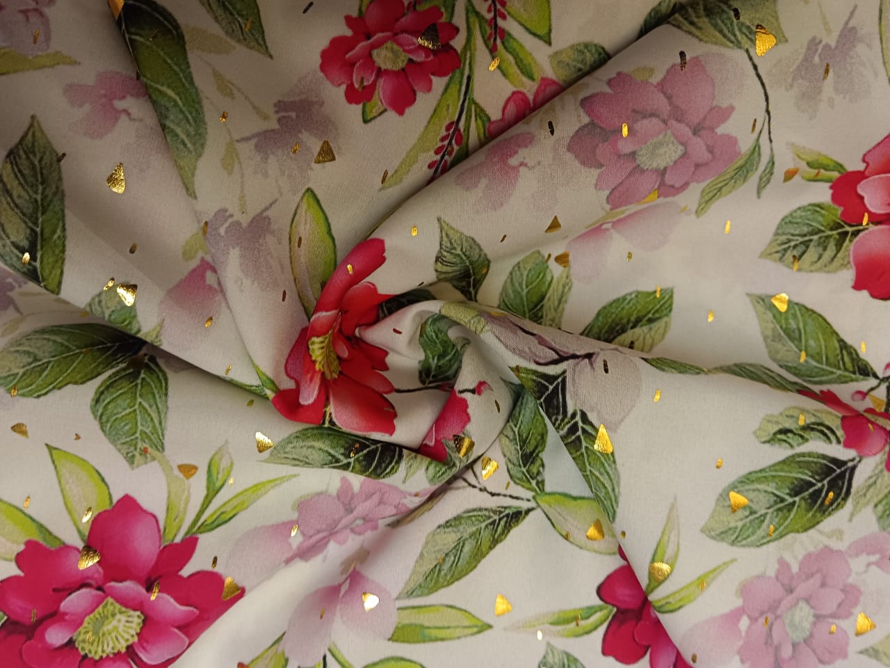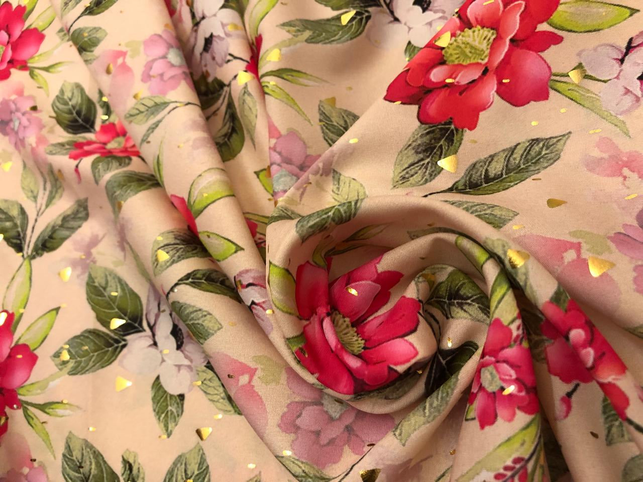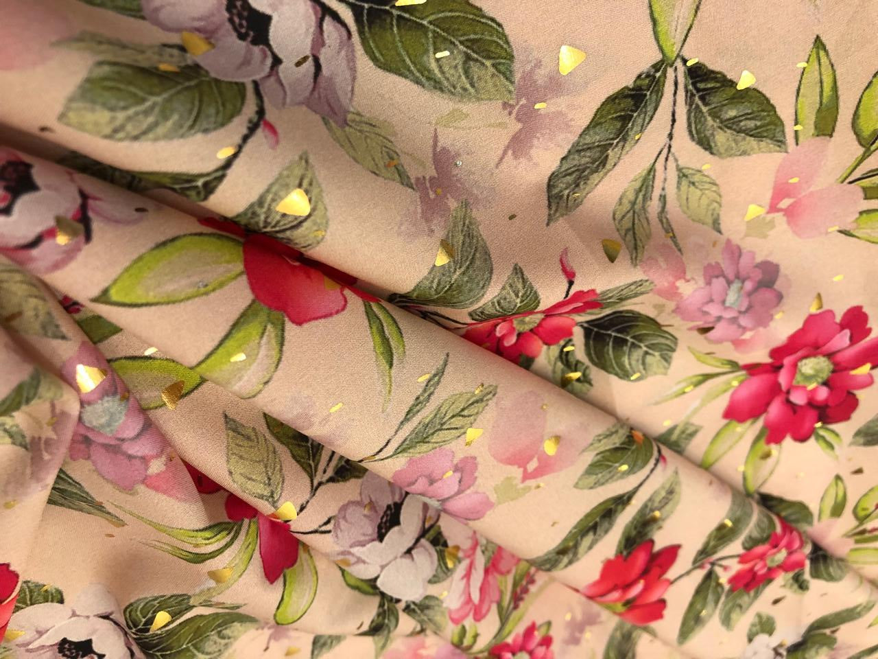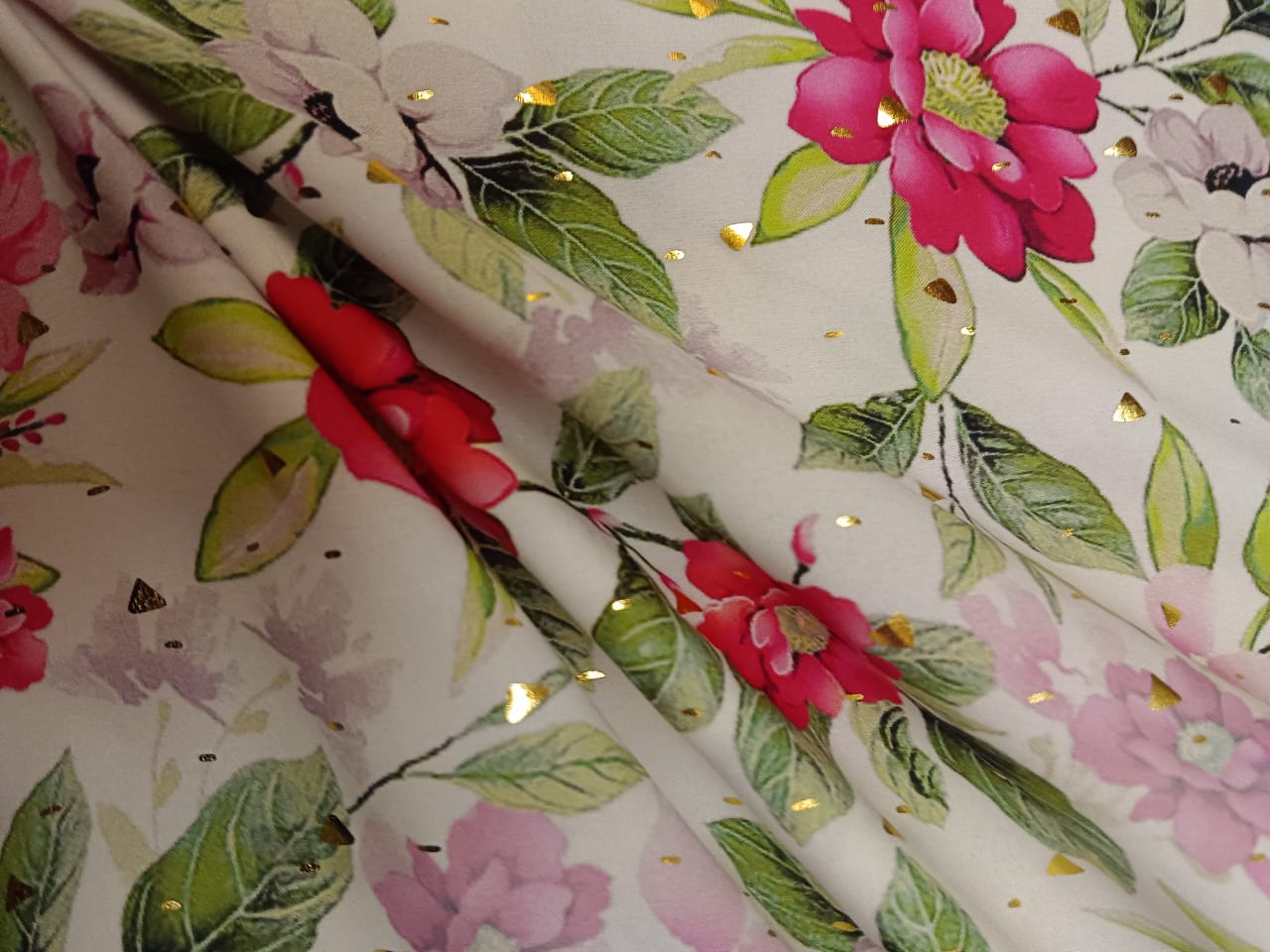 Satin fabric print 58" wide ARMANI  pink, lilac and green floral print and gold foil in 3 color background blush pink, powder blue and white[19064/69/70] ]
