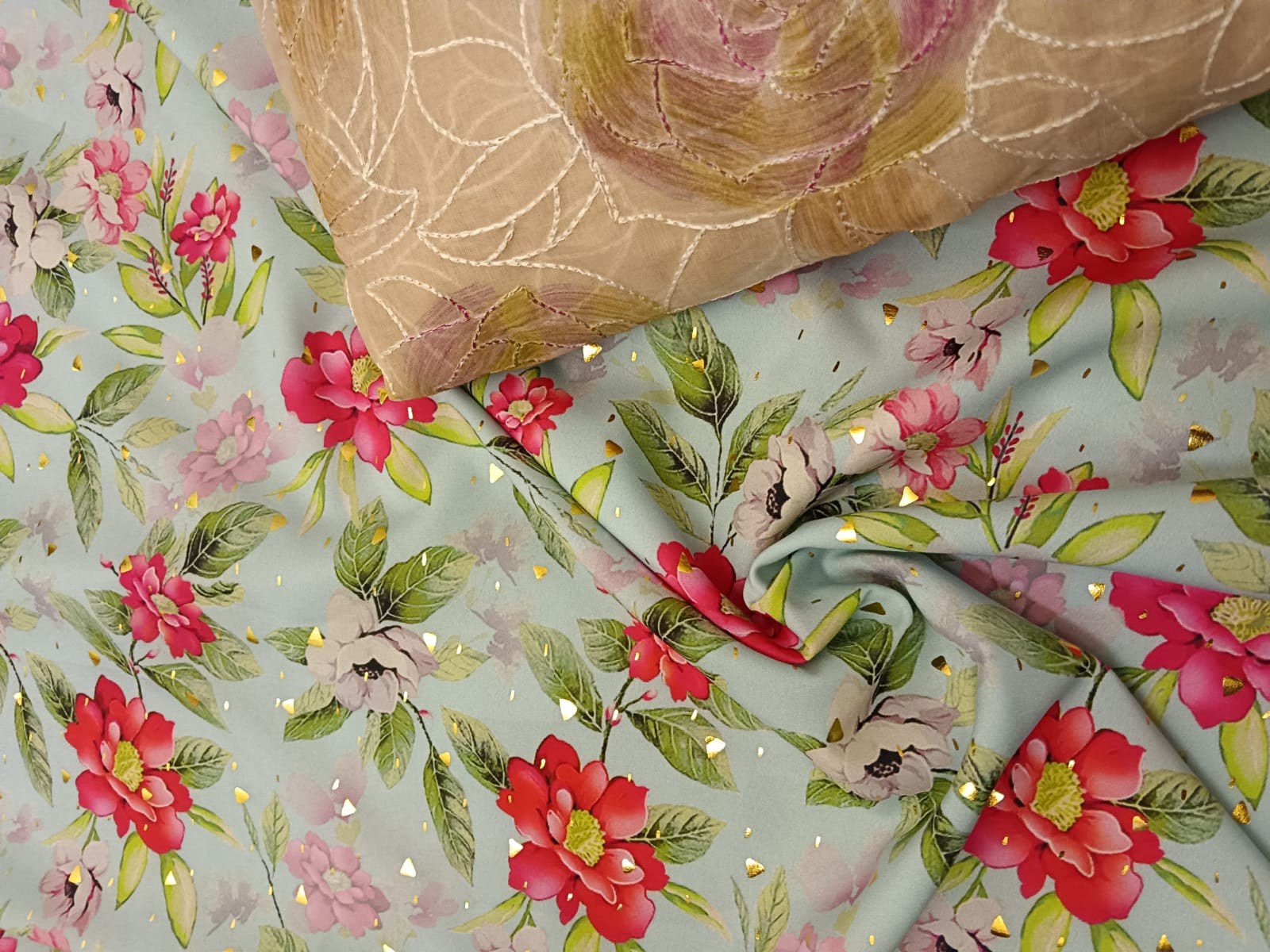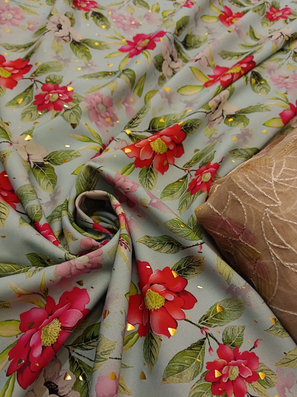 Satin fabric print 58" wide ARMANI pink, lilac and green floral print and gold foil in 3 color background blush pink, powder blue and white[19064/69/70] ]