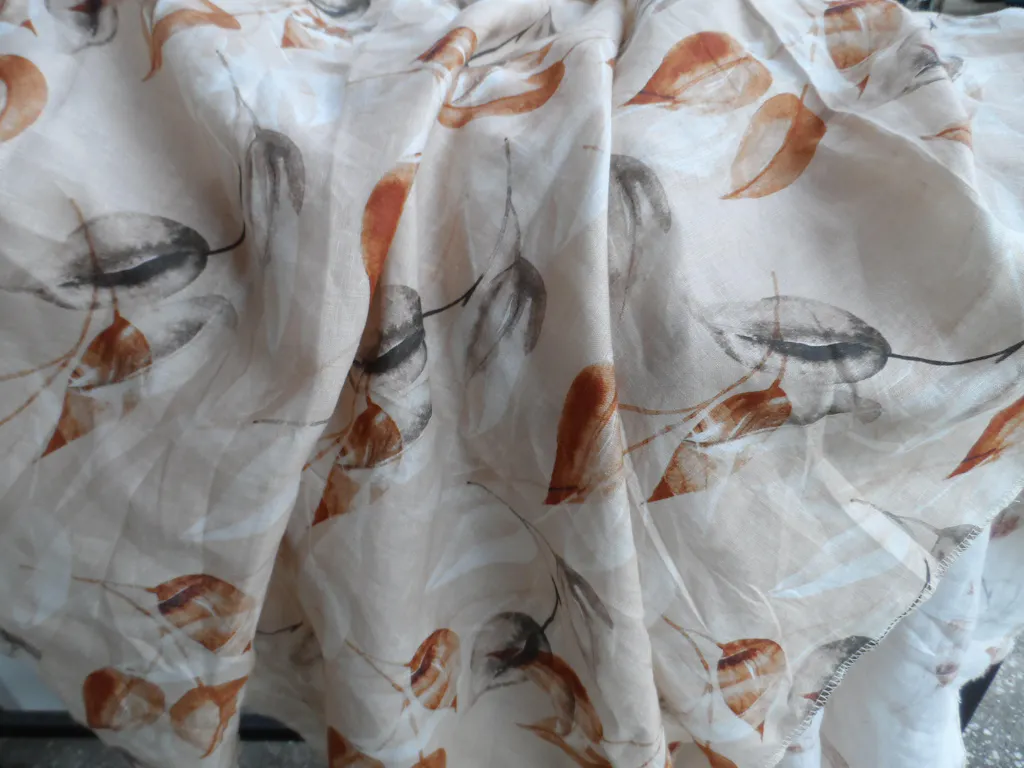 100% linen digital print fabric 58" wide SAND BEIGE WITH BARK BROWN AND BROWN COLOR LEAVES [16111]