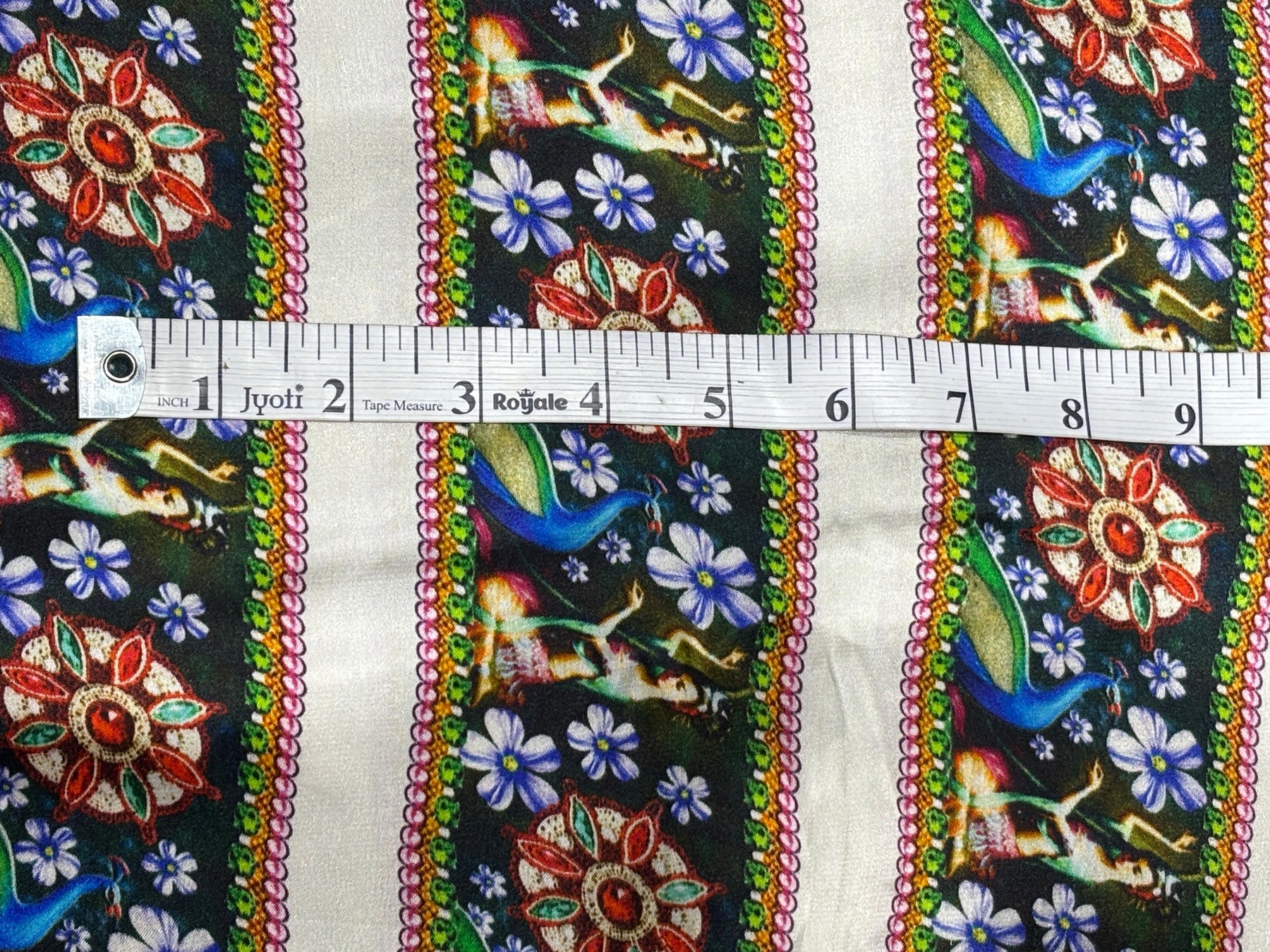 100% Pure Silk Satin 90 Grams Printed stripes of Indian classical dance with peacocks 44"Wide Fabric [17792]