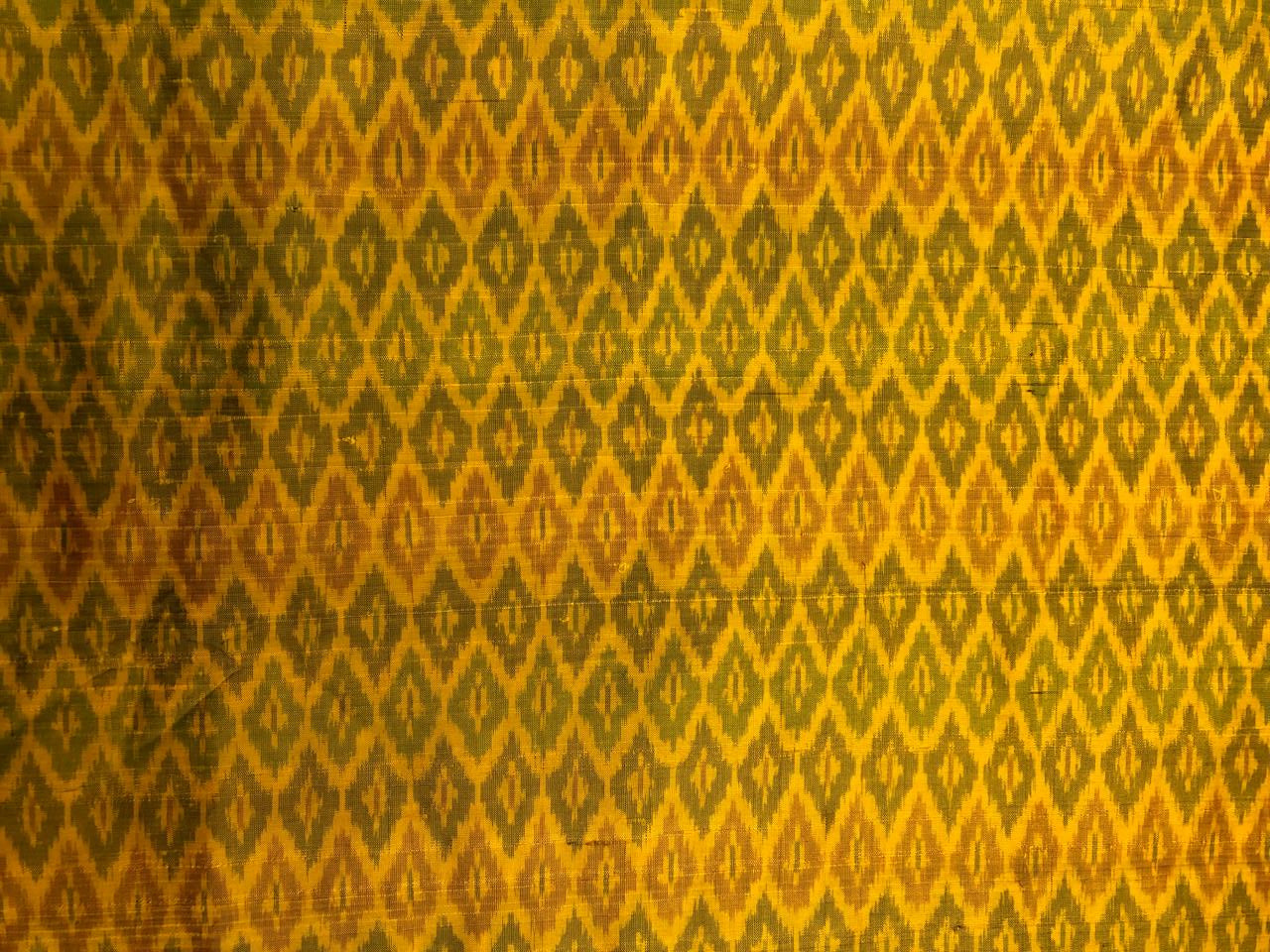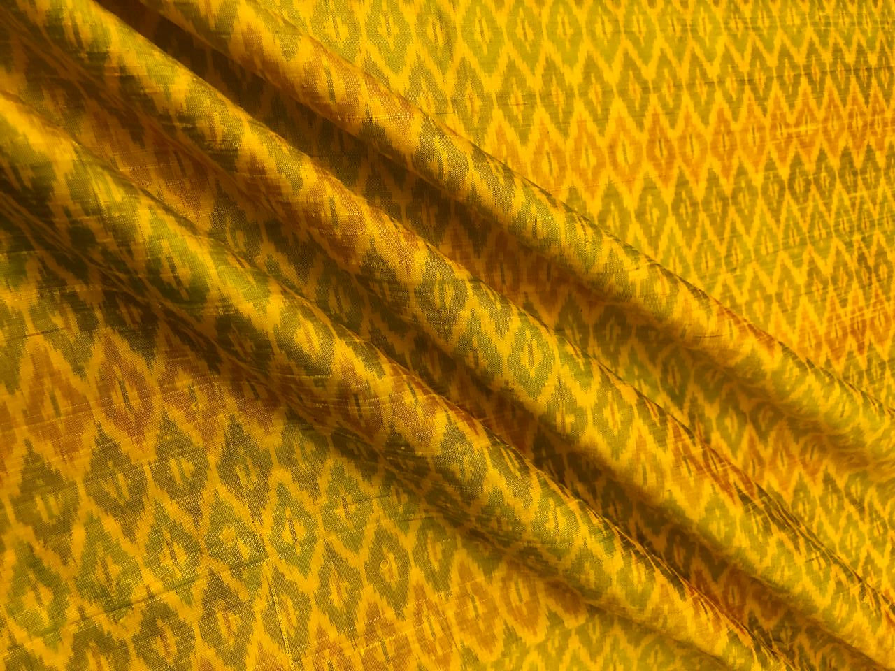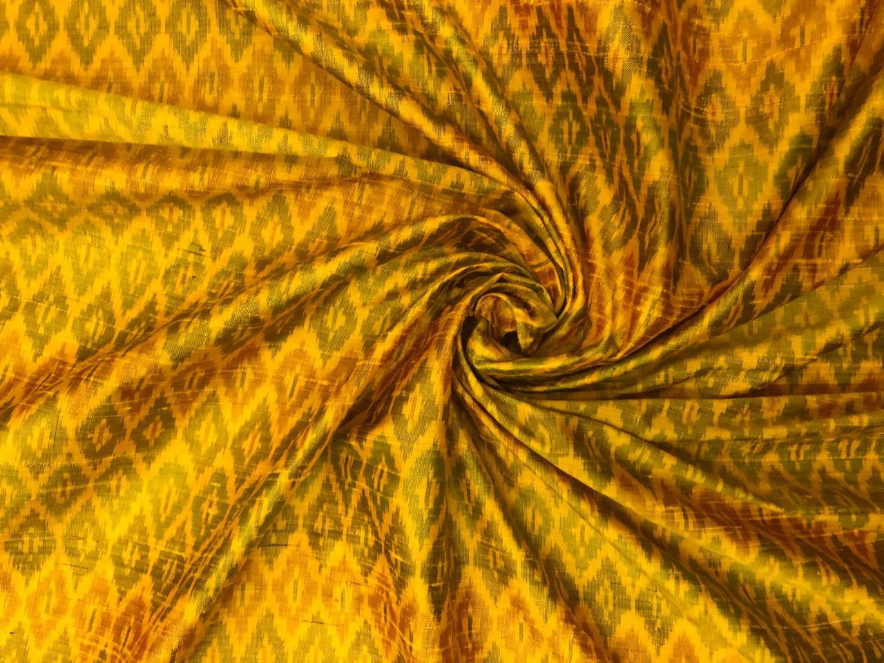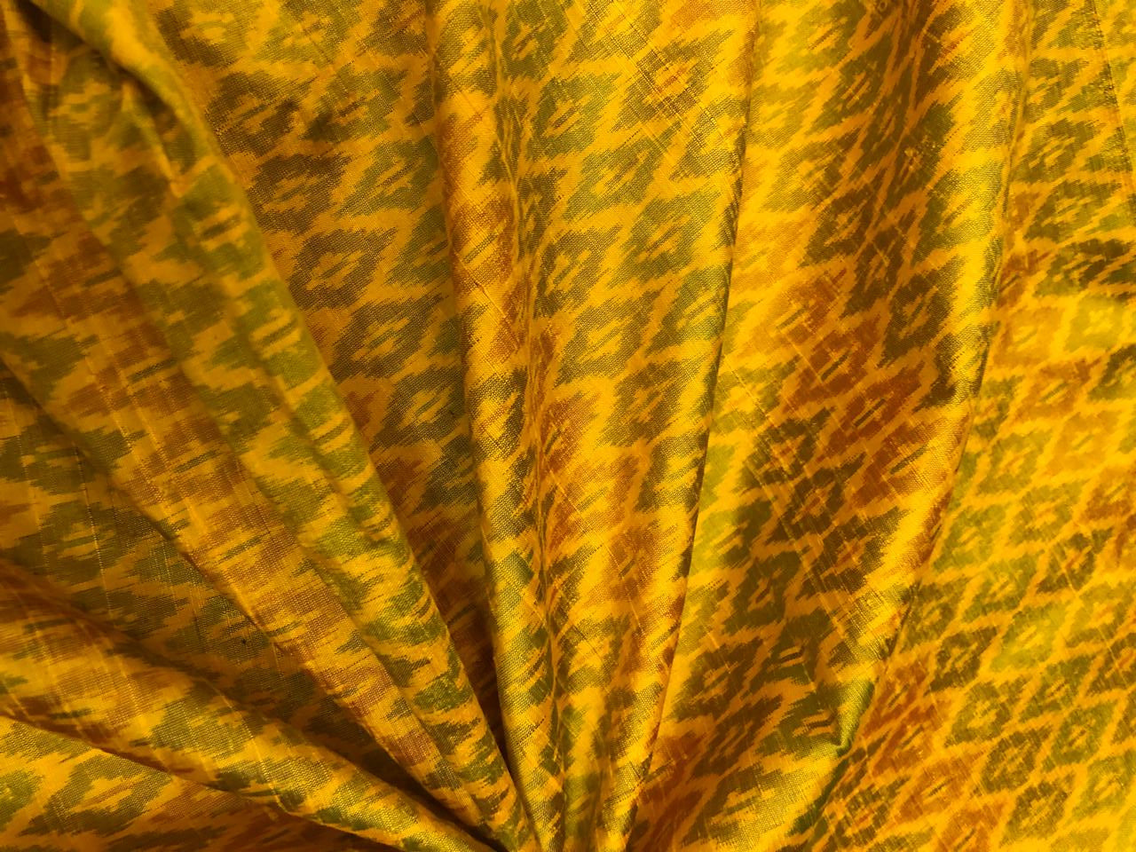 100% pure silk dupion ikat fabric yellow ,green and pinkish brown color zigzag pattern 44" wide [18788]