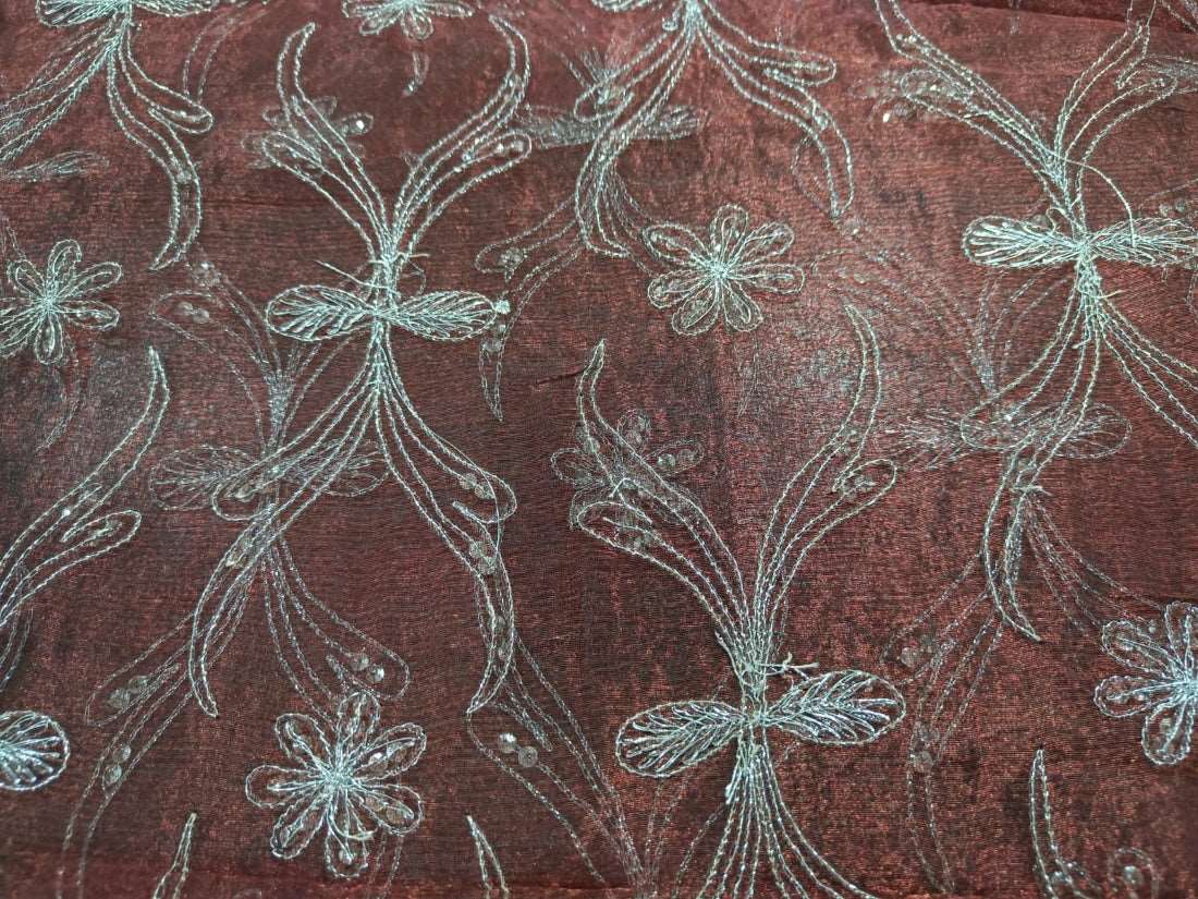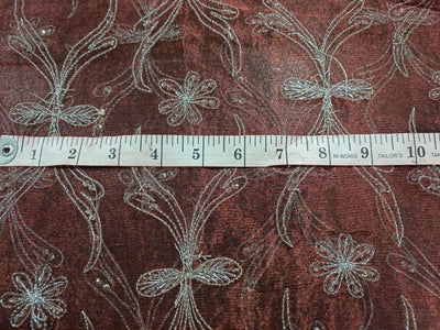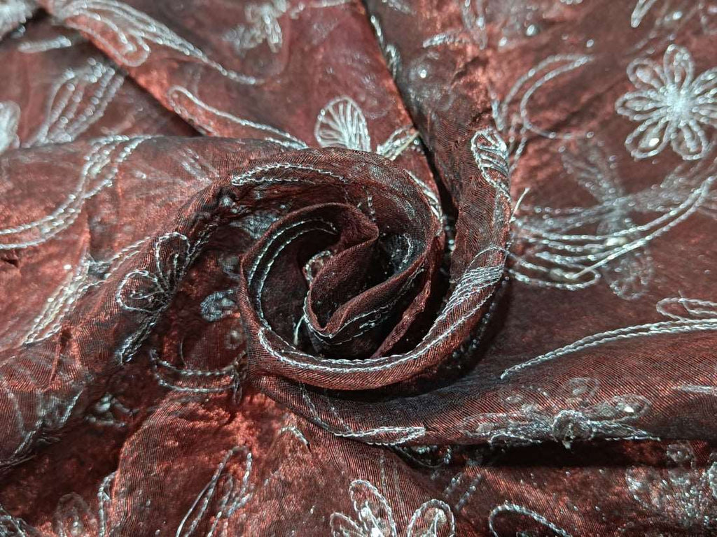100%  Silk tissue fabric copper brown with silver embroidery 44 inches wide