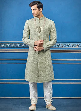 DUPIONI FABRIC 44" synthetic pastel green with ivory embroidery