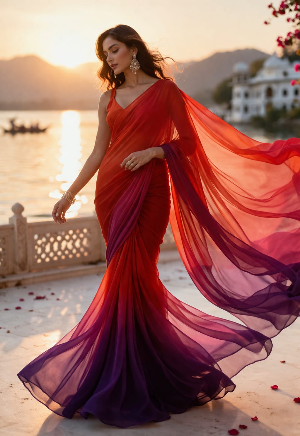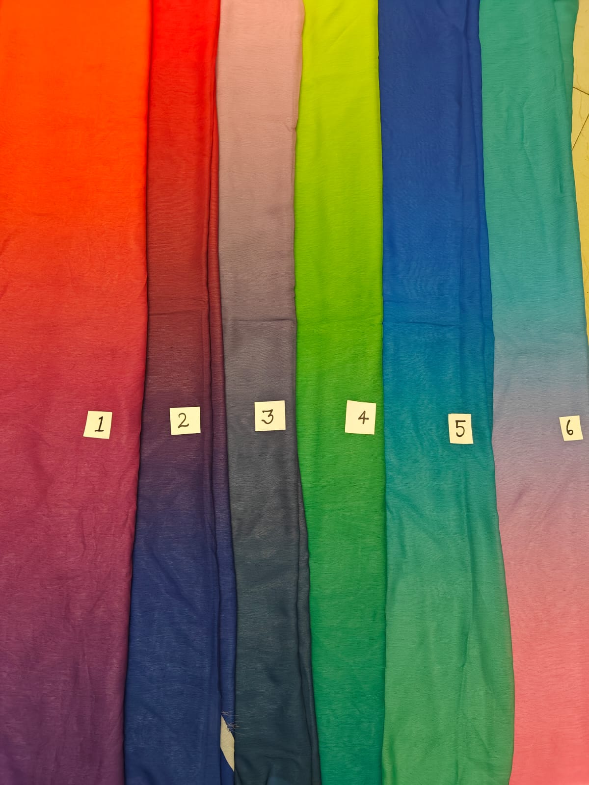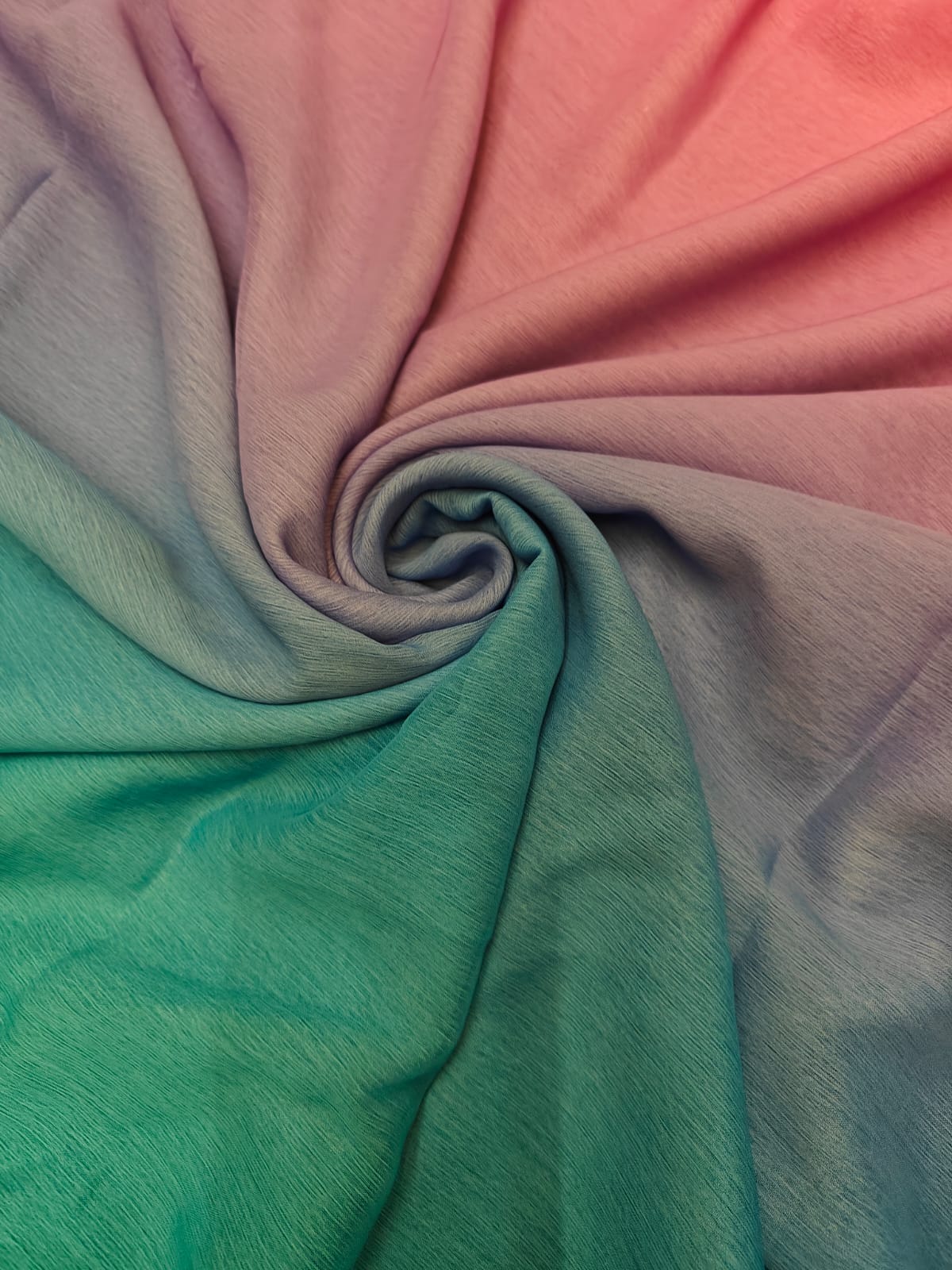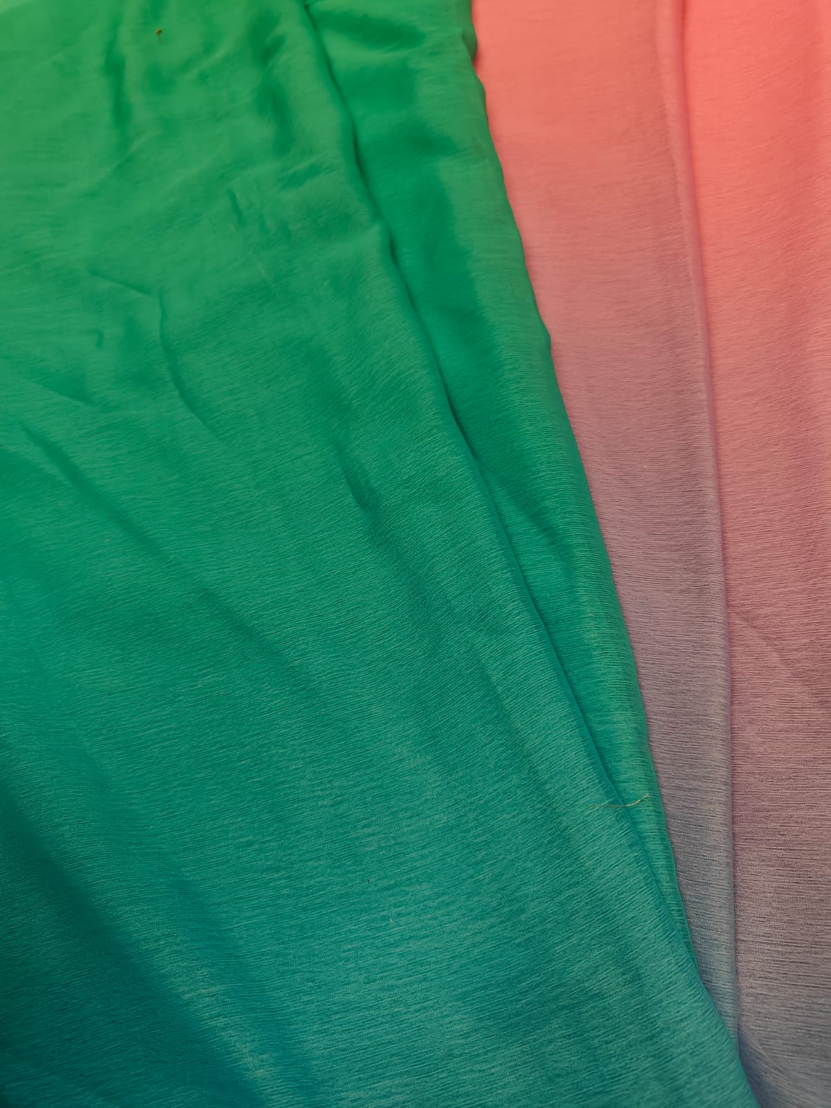 polyester chiffon with a striking ombré gradient, transitioning beautifully from a vibrant fiery red at the top into a deep wine / plum tone at the bottom