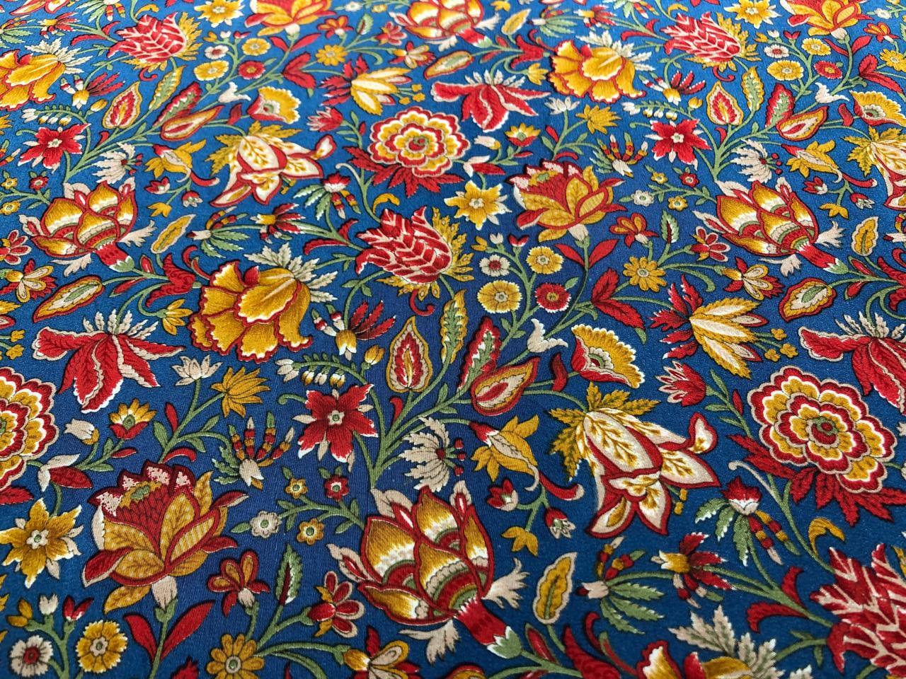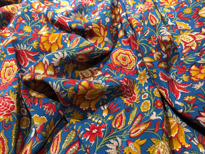 Pure silk crepe printed fabric 21.35 momme [80gms] teal blue with dusty orange ,red and green floral print [16950]
