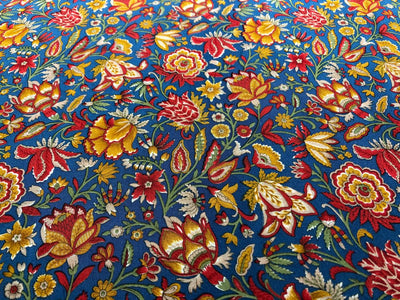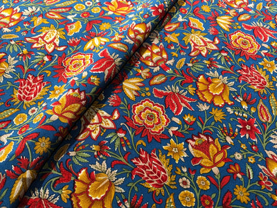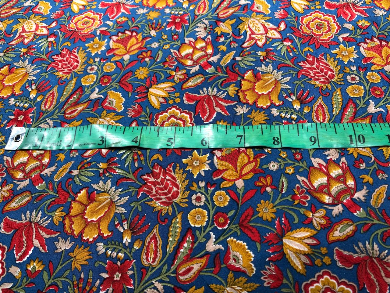 Pure silk  crepe printed fabric 21.35 momme [80gms] teal blue  with dusty orange ,red and green floral  print [16950]